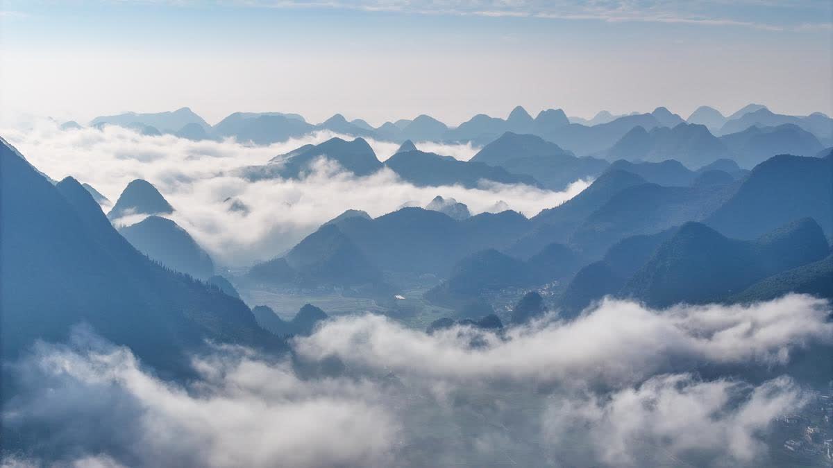 Aerial photos reveal the rolling, dough-like ridges around Xingyi in Guizhou province, all shrouded in mist.