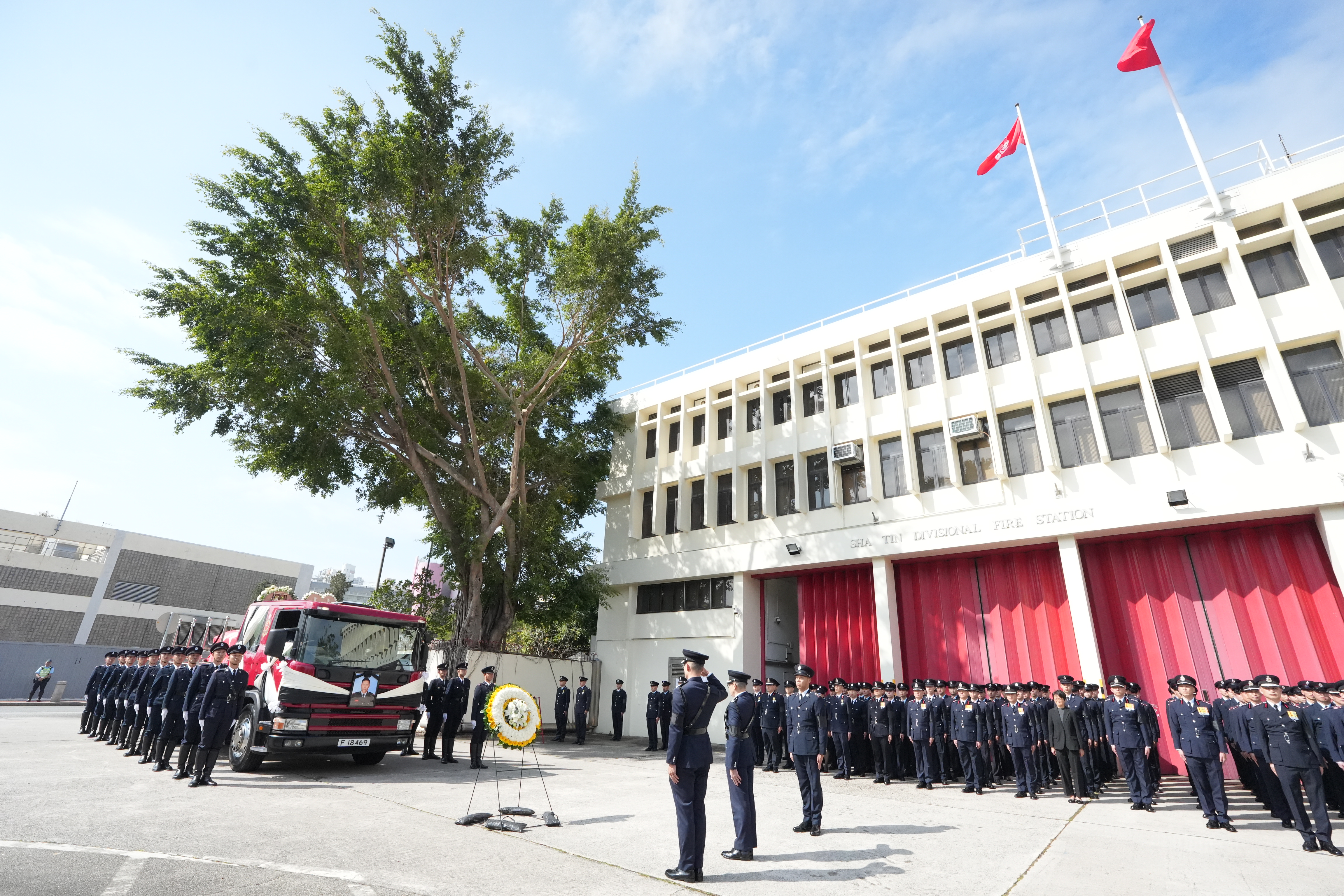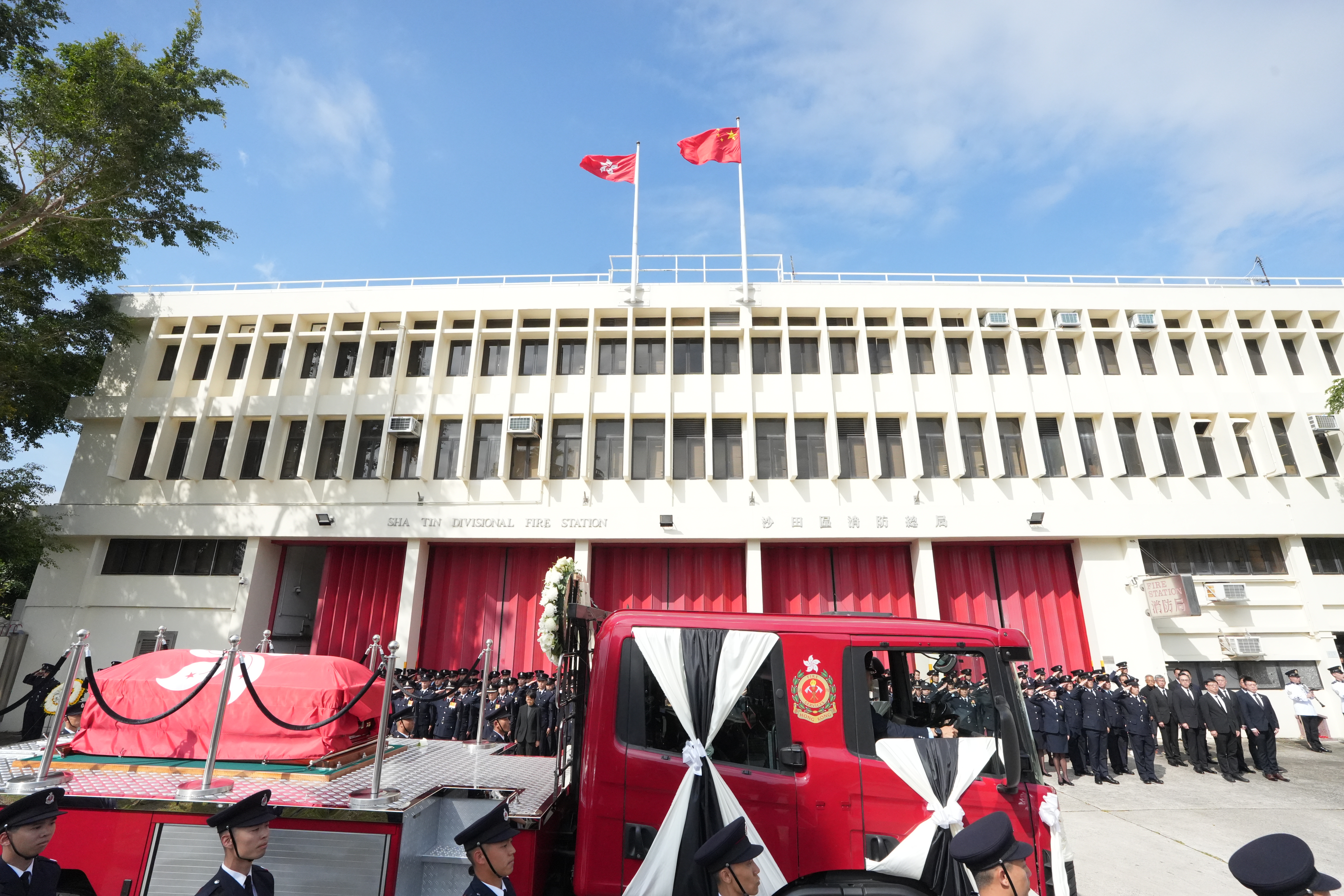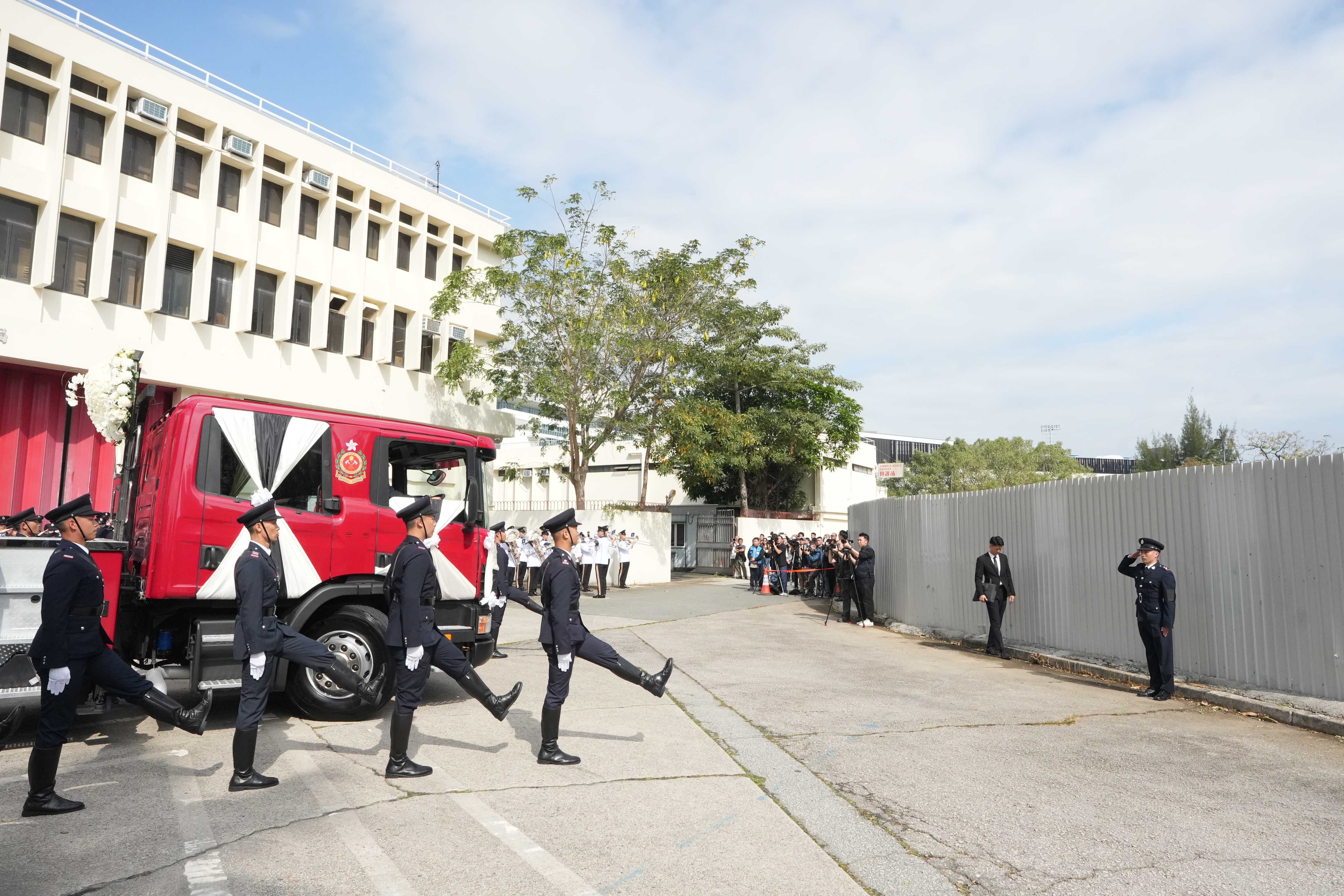 大公文匯全媒體記者中午12時許看到,靈車到達沙田消防局,消防處處長楊恩健帶領消防人員列隊致最後敬禮。靈柩之後將移送浩園安葬。