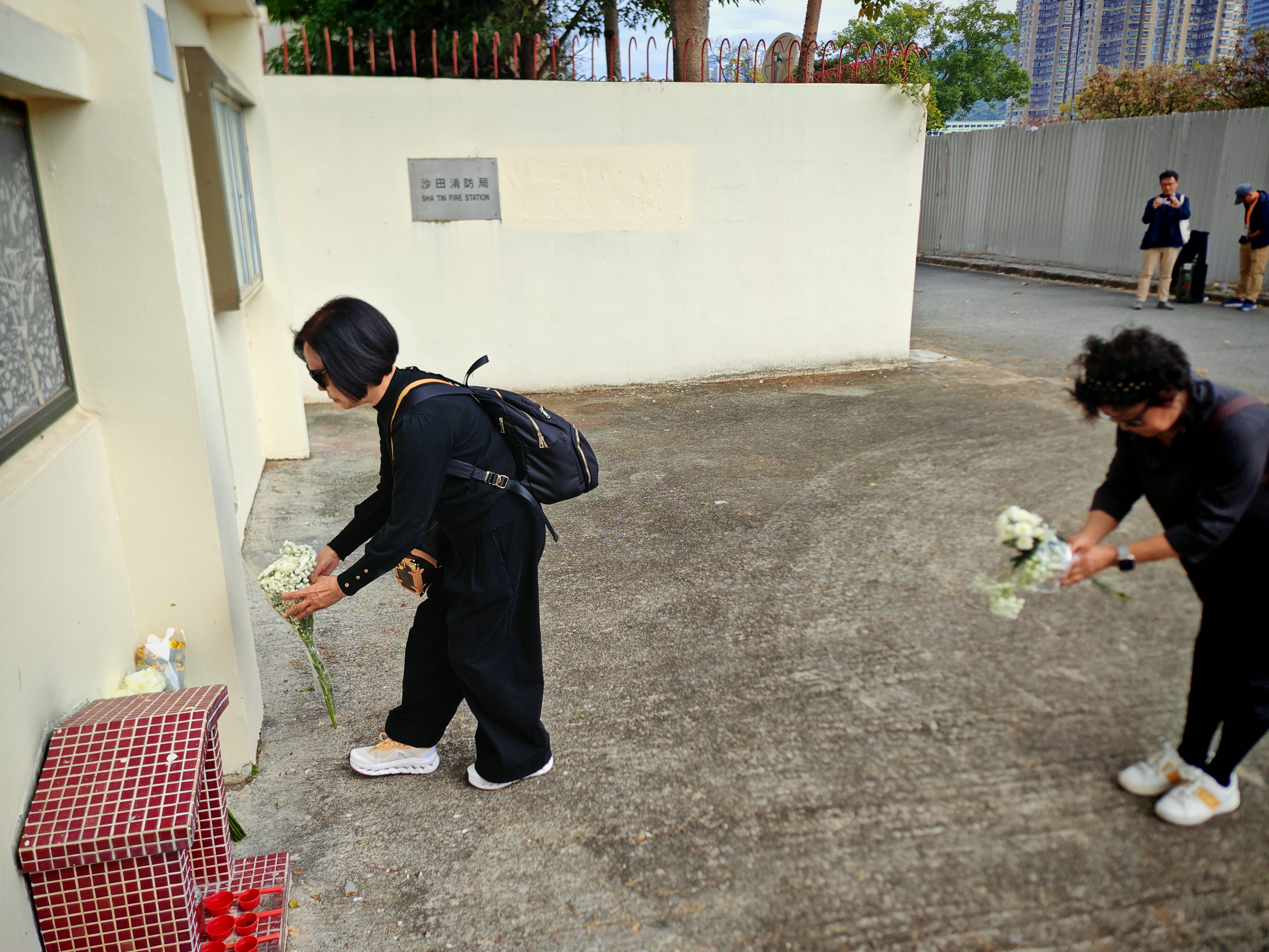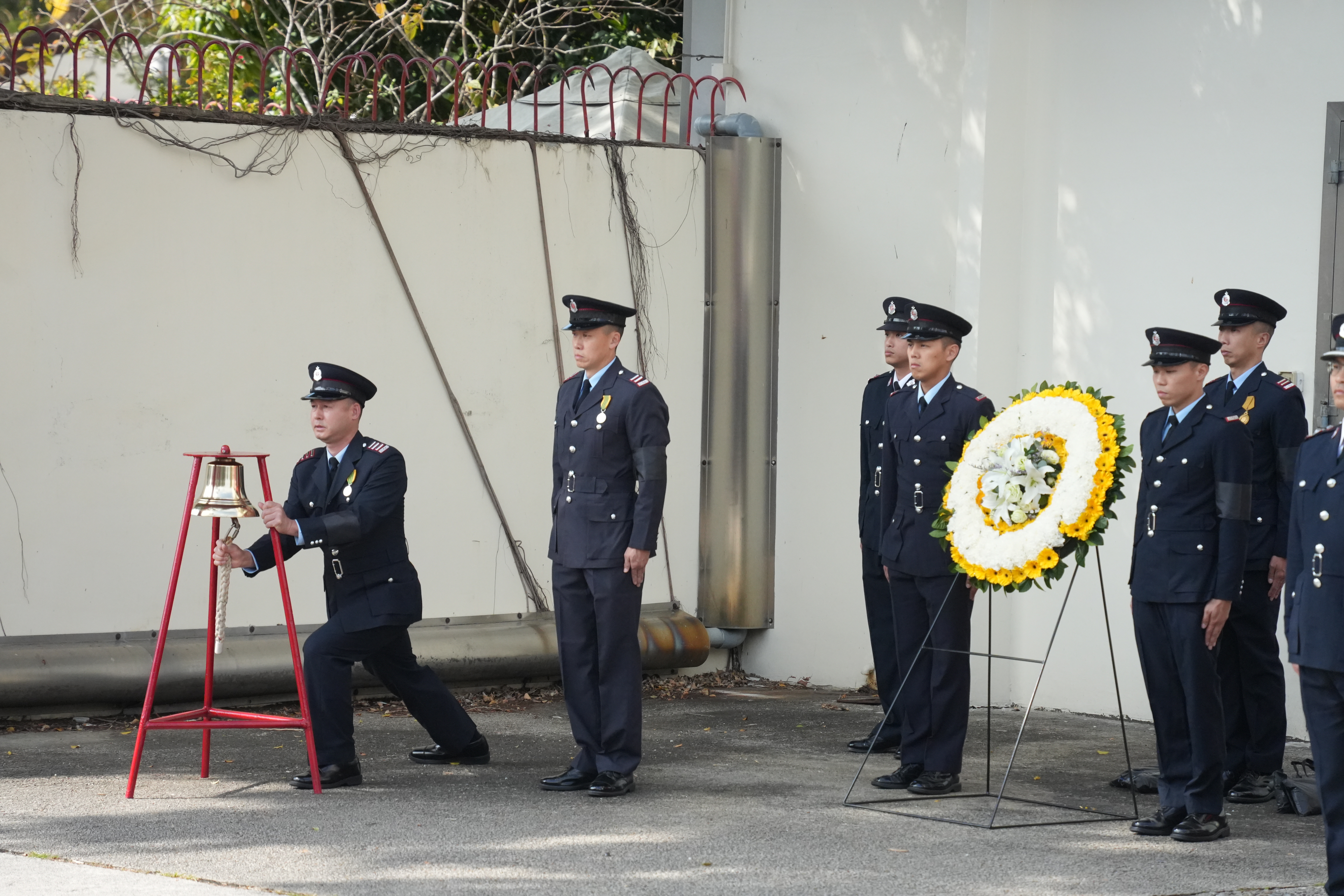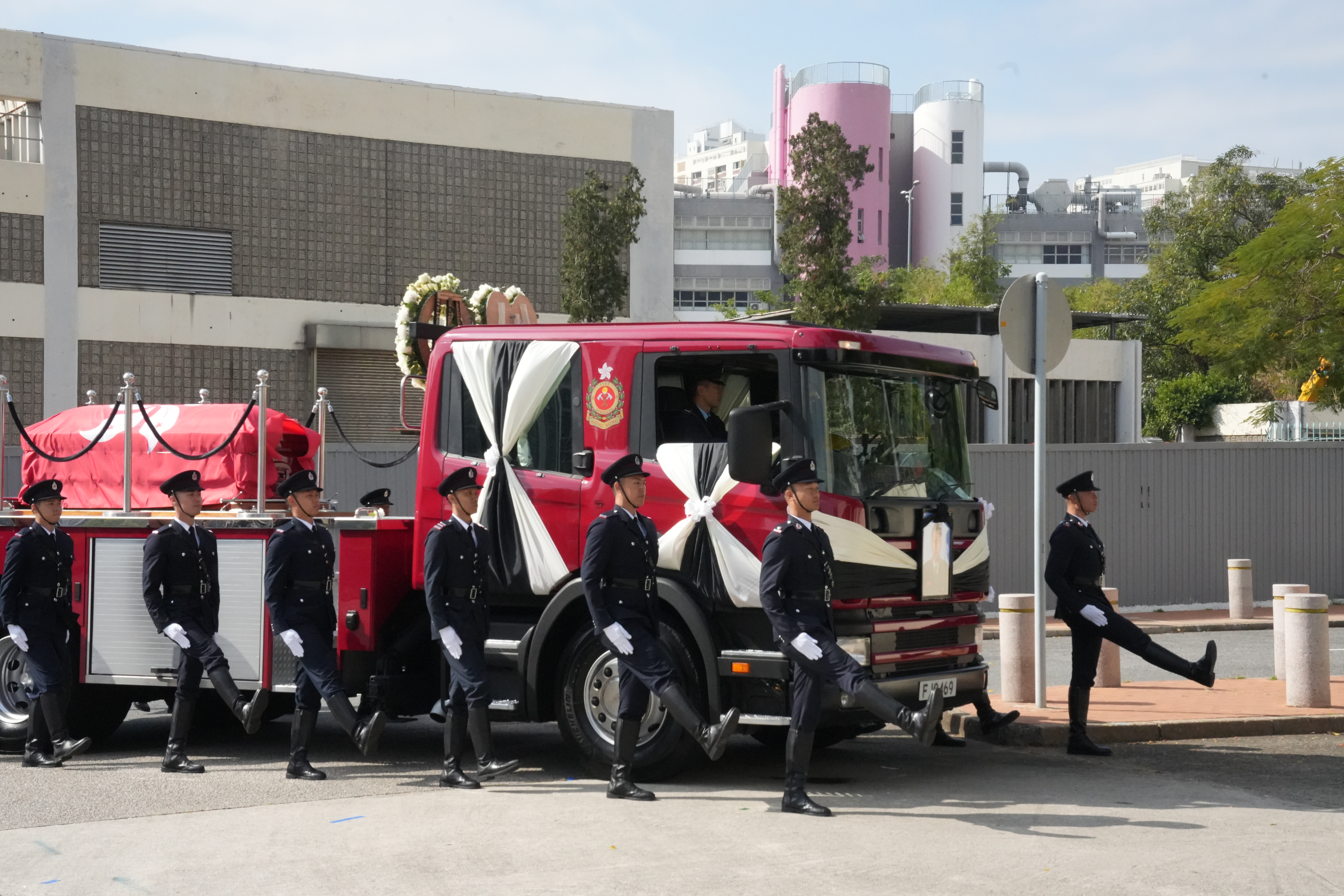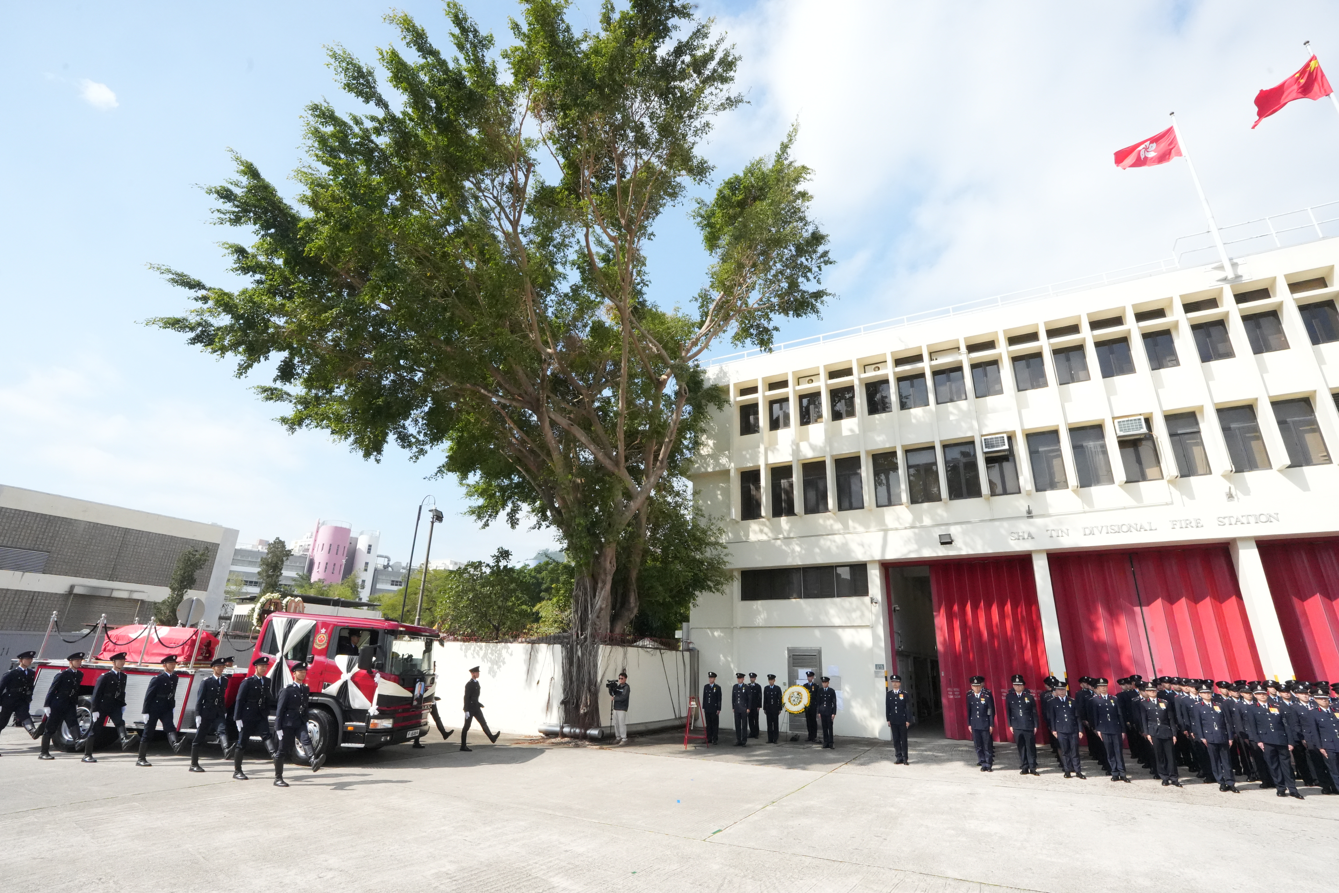 大公文匯全媒體記者中午12時許看到,靈車到達沙田消防局,消防處處長楊恩健帶領消防人員列隊致最後敬禮。靈柩之後將移送浩園安葬。