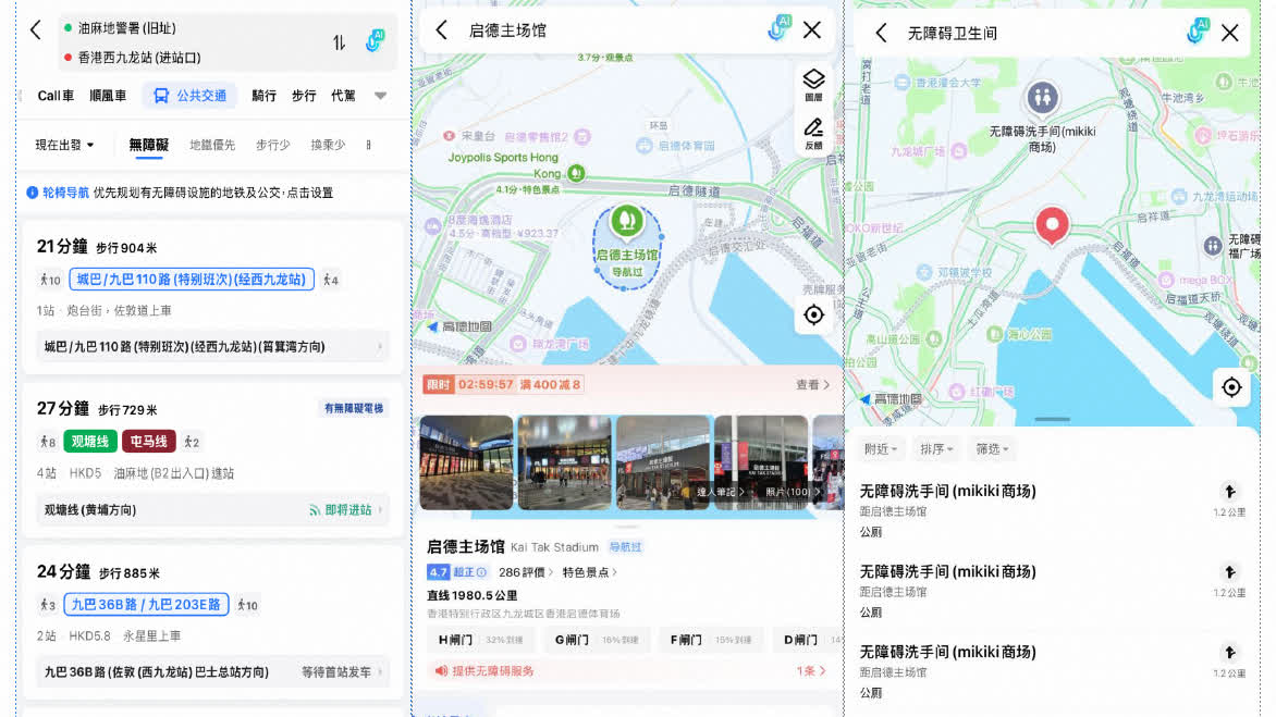 針對香港出行場景的特殊性,高德無障礙導航進行了精準適配與資源整合。目前已上線1000餘條無障礙巴士線路,收錄數千個無障礙設施點位,涵蓋無障礙直梯、無障礙洗手間、無障礙通道等核心公共設施,同時覆蓋90餘個重要場所,包括賽事場館、交通場站、酒店及購物中心等,用戶通過高德APP搜索,即可一鍵查詢這些場所的無障礙出入口、設施分布等關鍵信息。在導航體驗上,用戶開啟「無障礙模式」後,系統將自動優先推薦配備無障礙直梯、升降機的地鐵及有無障礙設施的公交路線。