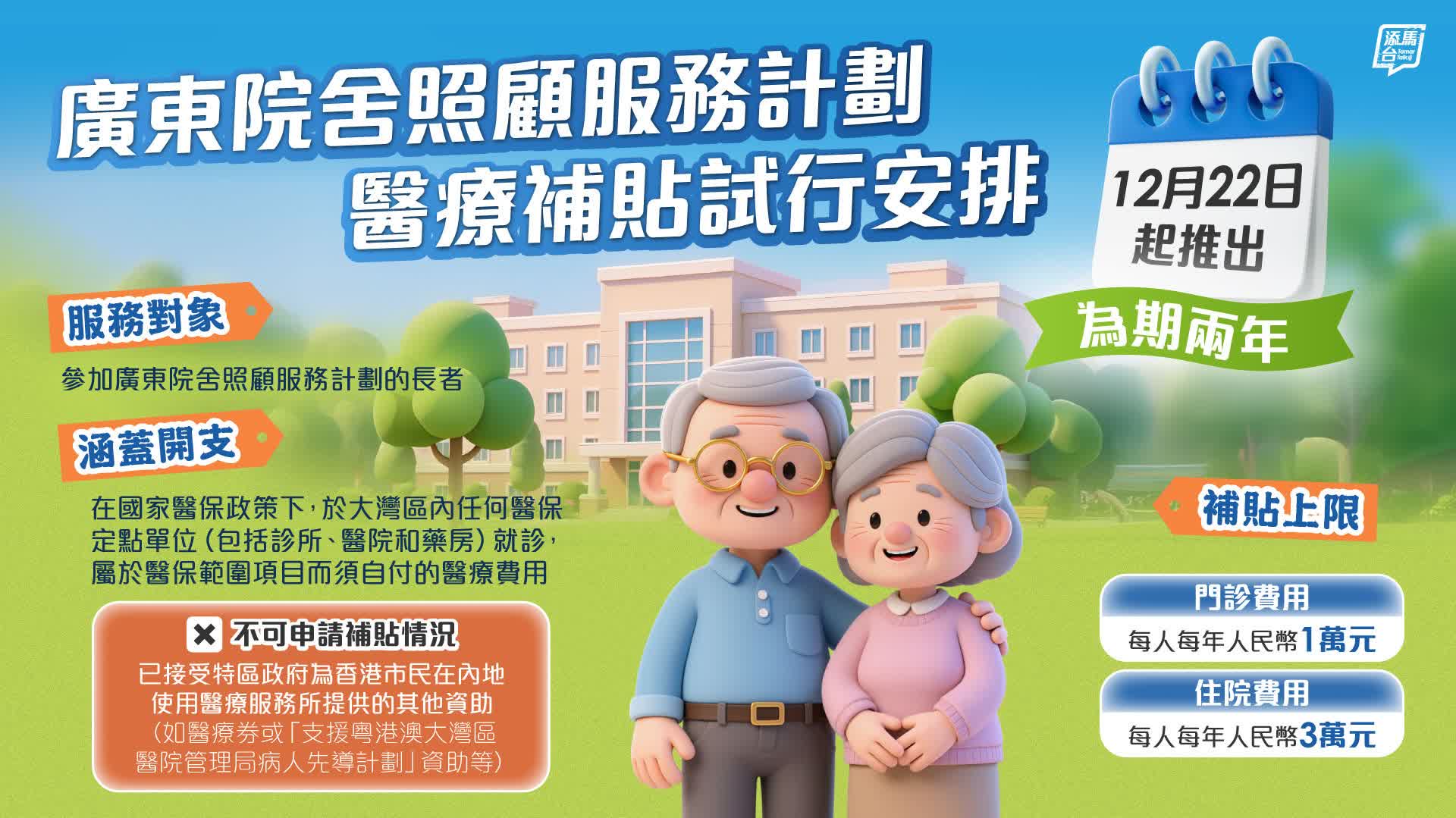 廣東院舍照顧服務計劃——醫療補貼試行安排下周一(12月22日)起推行,為參加計劃的長者在粵生活提供進一步醫療支援。在國家醫療保障政策下,長者於大灣區內任何醫保定點單位就診,可就屬於醫保範圍項目而須自付的醫療費用申請補貼。試行安排為期兩年,看圖了解詳情。