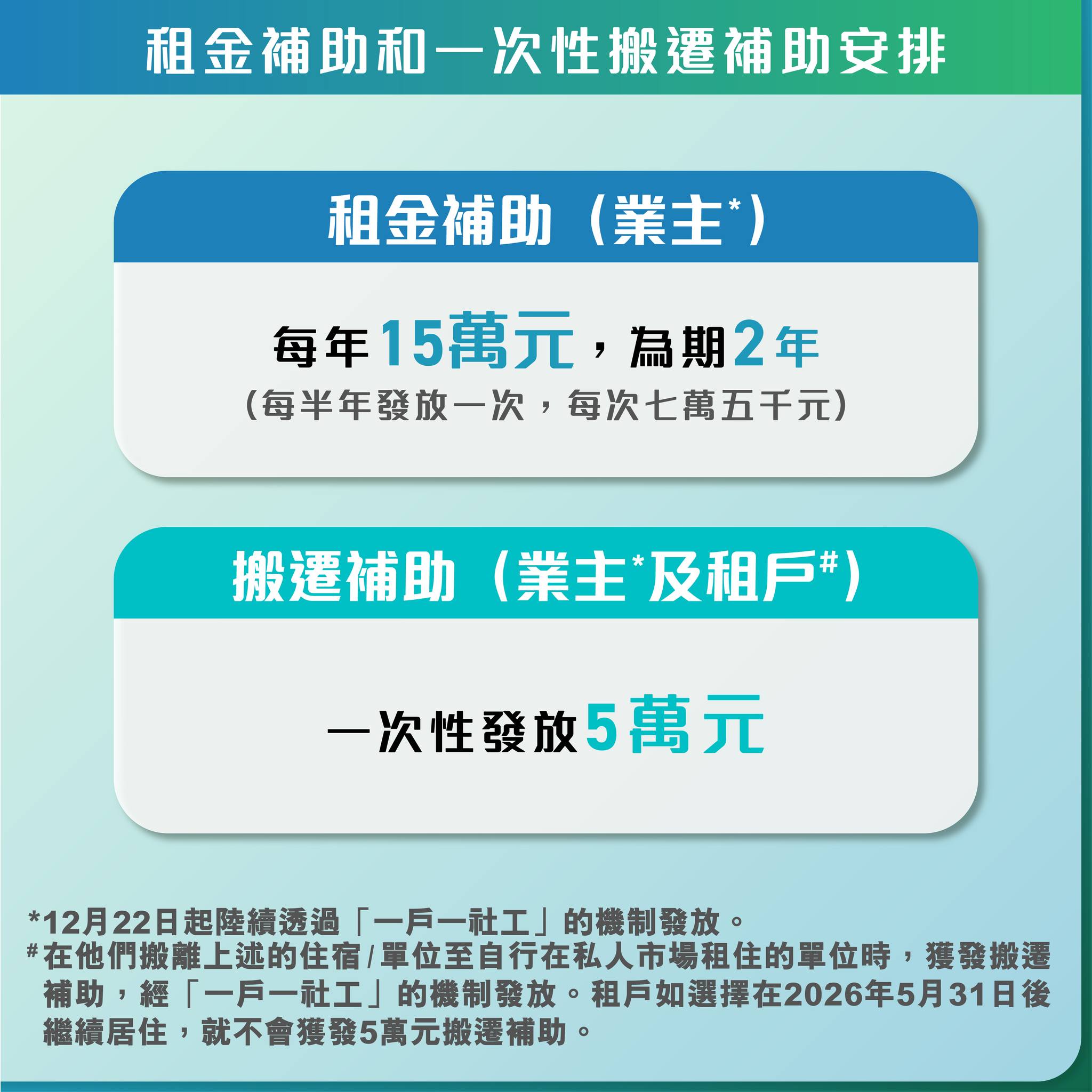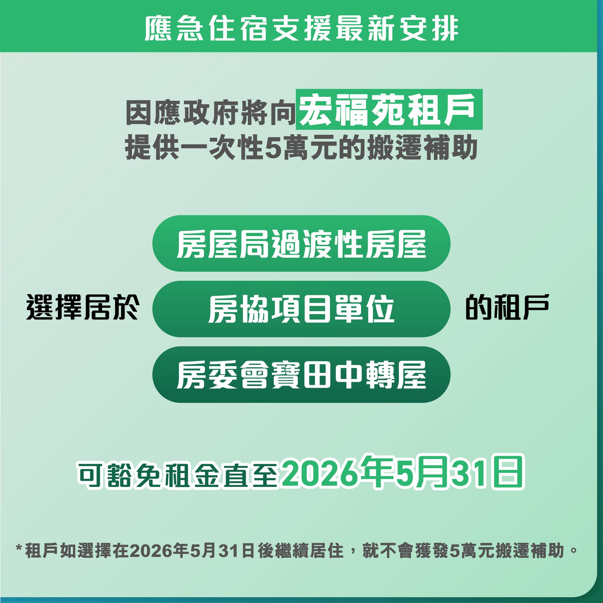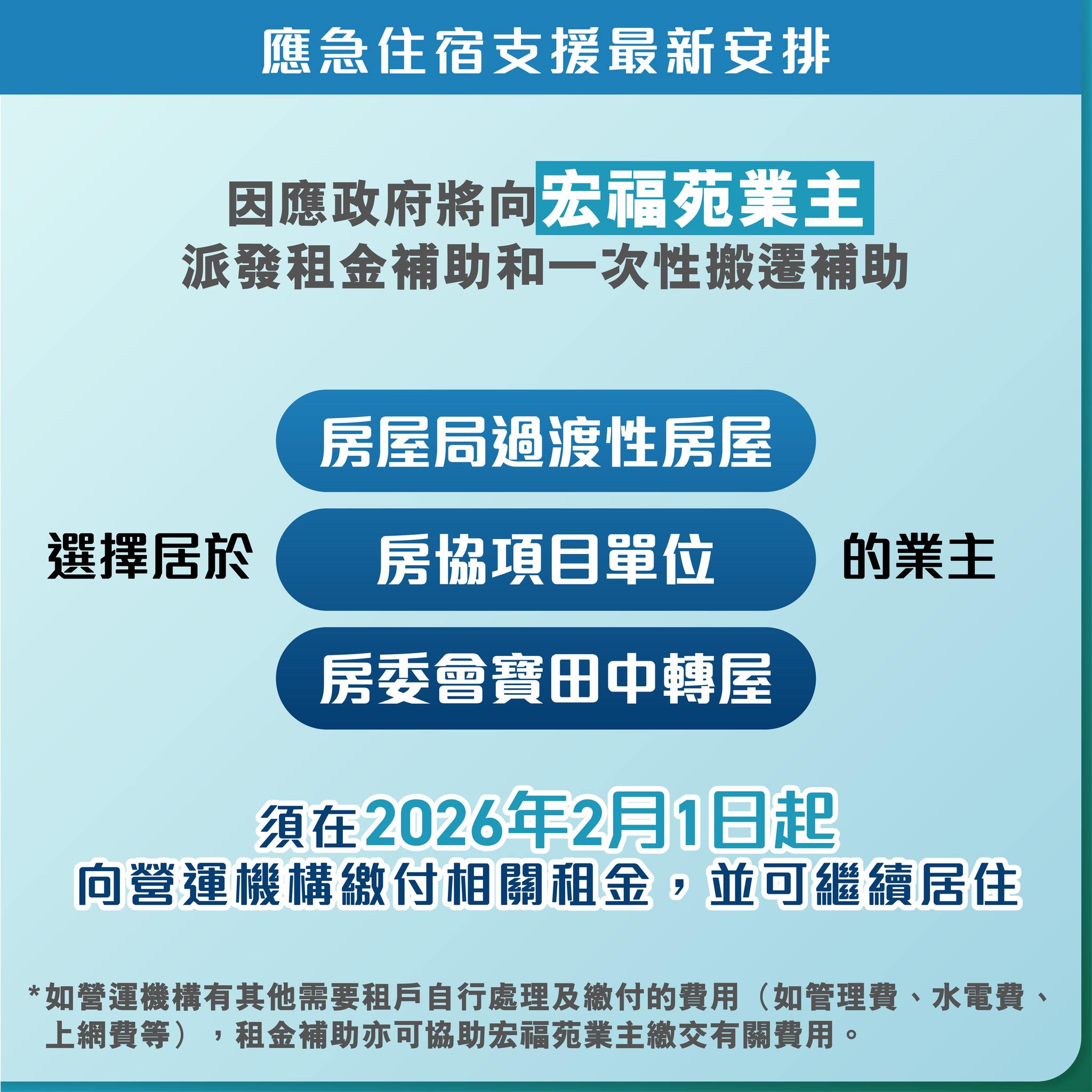 大公文匯全媒體早前向房屋局查詢,受影響的宏福苑業主是否同租戶享有同樣的免租金待遇至2026年5月31日。當時房屋局回覆指,宏福苑業主收取租金津貼後,他們可以自行決定居住安排。他們可以居住於過渡性房屋、房協項目單位或寶田的中轉屋,亦可以到私人市場自行租屋。房屋局亦透露,考慮要求宏福苑業主於2026年2月開始向營運機構繳付相關租金。