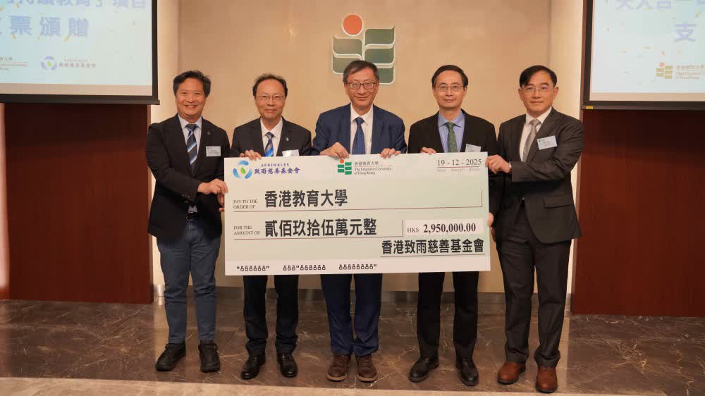 支票捐贈儀式於2025年12月19日在教大大埔校園舉行,由致雨慈善基金會主席馬駿博士主持捐贈,教大校長李子建教授、協理副校長(知識轉移與可持續發展)翁建霖教授,以及中國語言學系高級講師賴志成博士代表校方接受。