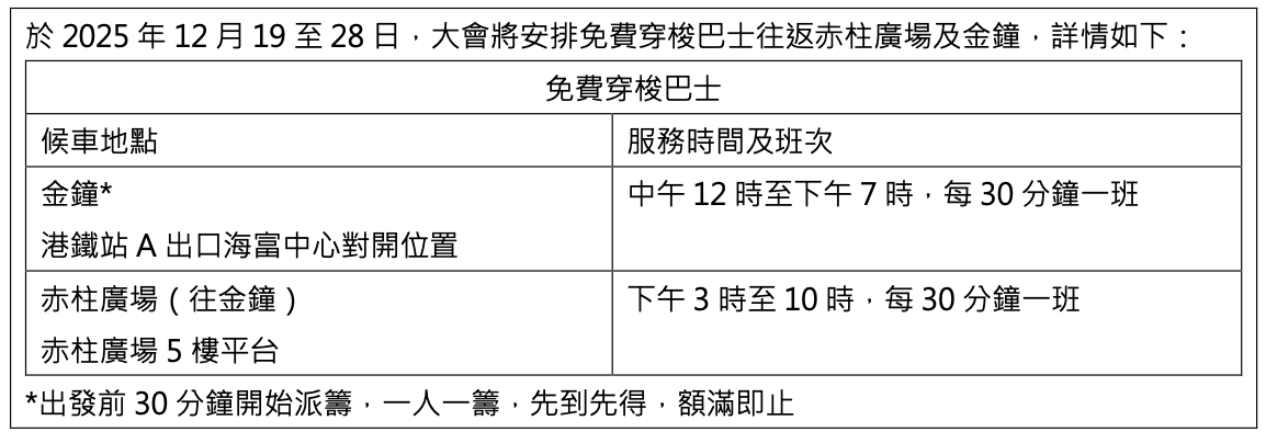 為方便大家往返南區及活動場地,赤柱廣場於活動期間特設免費穿梭巴士往返金鐘,有關交通安排詳情請留意赤柱廣場社交媒體公布。此外,赤柱廣場再次與Klook合作,駕駛人士現可於Klook預約停車場車位服務,優先預約指定時段的泊車位。