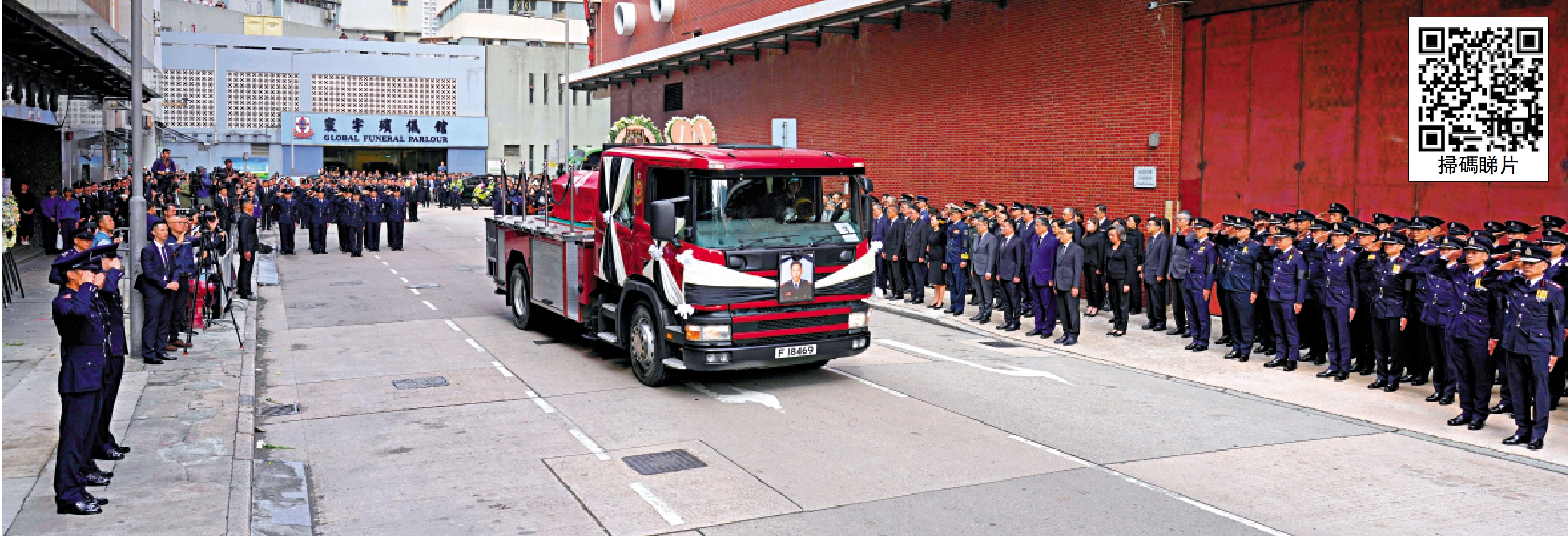 (大公報記者 黃佩琳)在大埔宏福苑大火英勇殉職的消防隊目(追授)何偉豪,昨日以最高榮譽喪禮形式舉殯,靈柩蓋上區旗,移送浩園安葬。在紅磡世界殯儀館外,大批市民夾道揮手送別英雄,感謝他為保護市民,用生命拯救生命。消防處讚揚何偉豪奮勇無畏、捨己為人的專業精神,足為典範,將永誌香港市民心中。