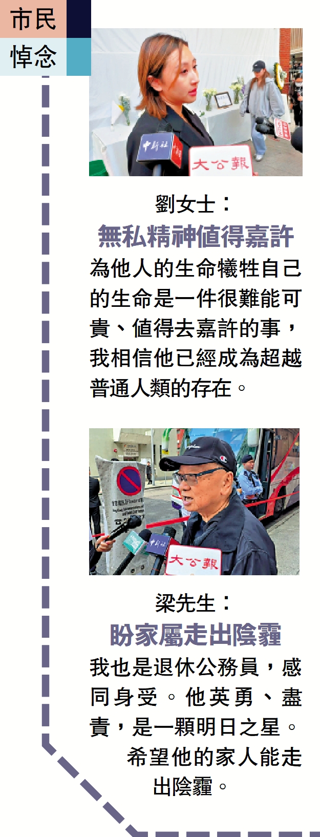 昨日早上七時半就到達殯儀館悼念何偉豪的市民王女士說,「感謝他這麼英勇,感謝香港有這麼棒的消防員。」她說日後到浩園附近墳場為家人掃墓時,也想去拜祭何偉豪。
