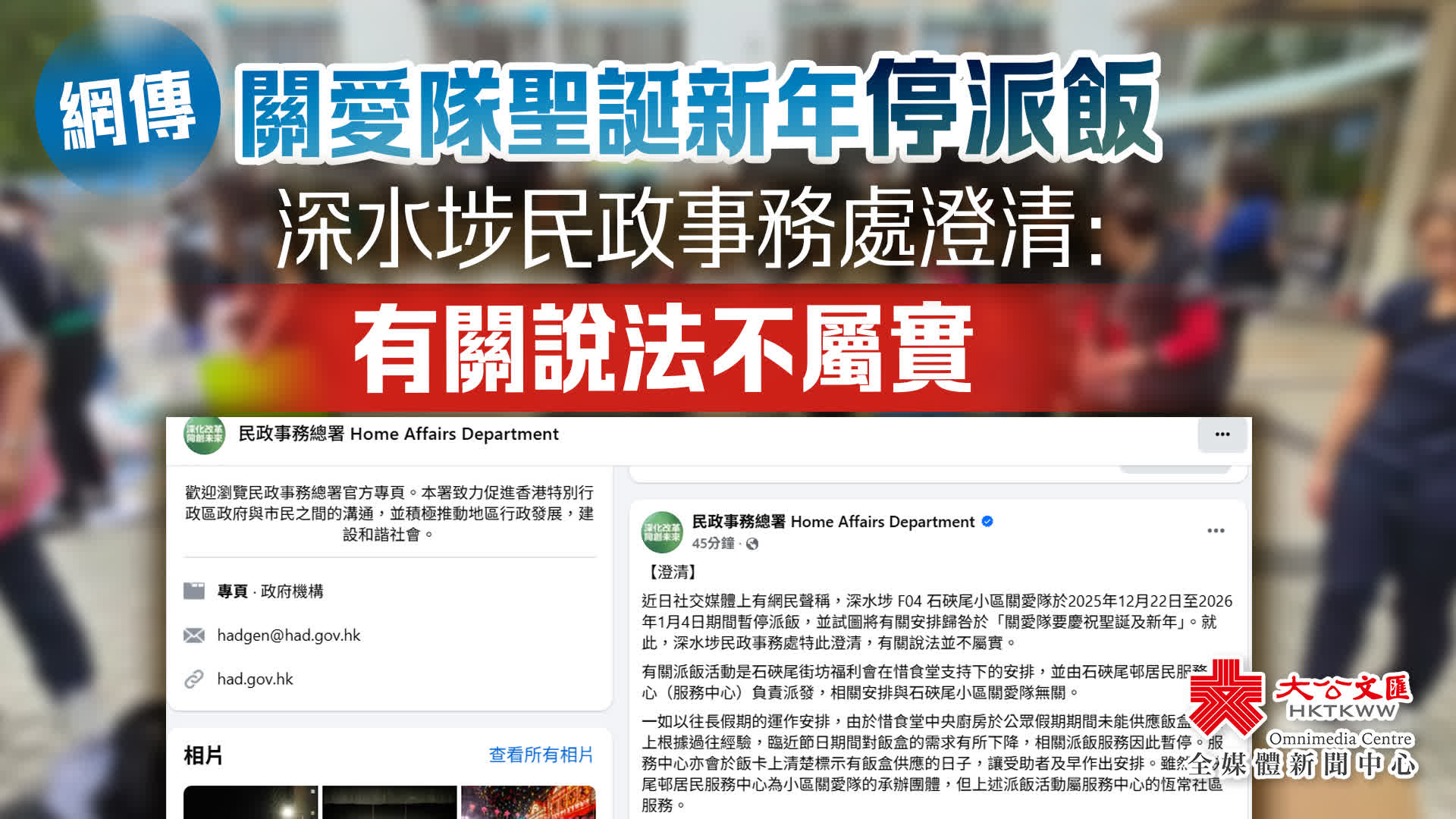 大公文匯全媒體報道,民政事務總署今日(20日)在社交專頁表示,近日有網民聲稱深水埗石硤尾小區關愛隊於12月22日至明年1月4日期間暫停派飯,並試圖將有關安排歸咎於「關愛隊要慶祝聖誕及新年」,深水埗民政事務處澄清,指有關說法並不屬實。