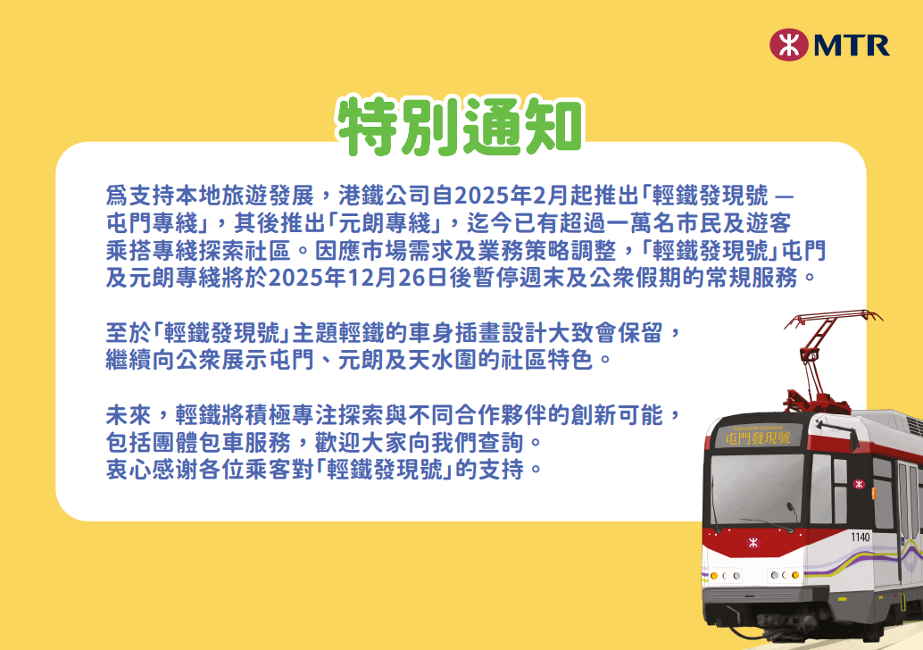 港鐵指,「輕鐵發現號」屯門專綫自今年2月推出,其後再推出「元朗專綫」,迄今已有超1萬名市民及遊客乘搭專綫探索社區。至於「輕鐵發現號」主題輕鐵的車身插畫設計大致會保留,繼續向公眾展示屯門、元朗及天水圍的社區特色。
