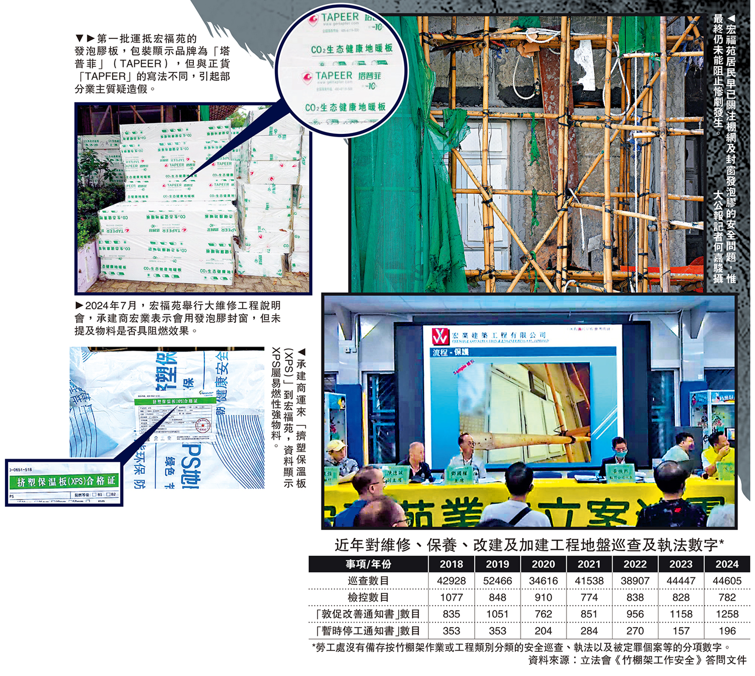 大埔宏福苑五級大火,棚網及用來封窗的發泡膠板,成為火勢迅速蔓延的主要原因之一,事後更揭發棚網檢測證書造假,發泡膠板疑用冒牌貨而且極度易燃,現行監管制度存在漏洞。有工程業界認為,現行機制奉行「信任制度」,只要求相關人士自律提交真實報告。專家建議優化機制,法團及各持份者,各司其職共同監察。