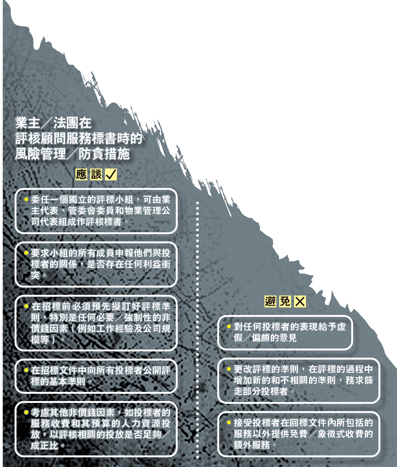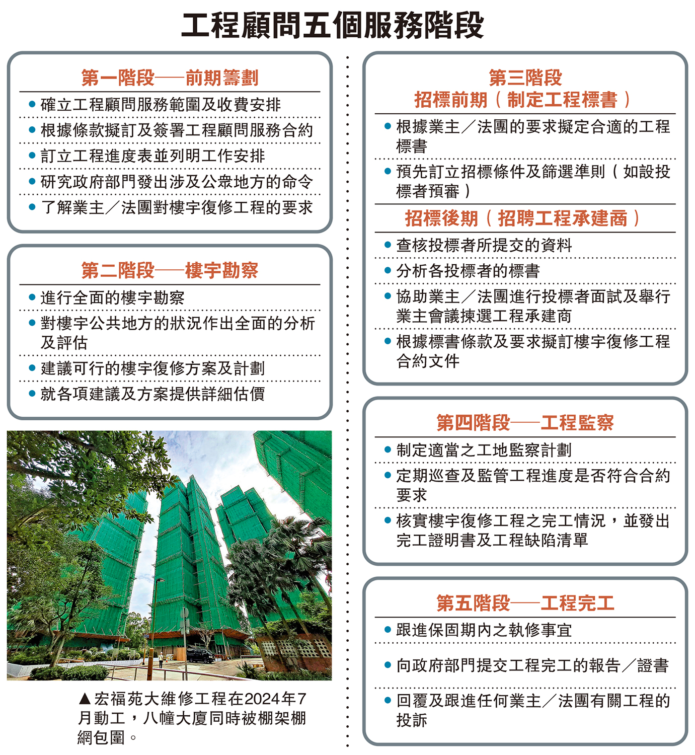 有工程界候任立法會議員建議,未來政府可擴大「招標妥」樓宇復修促進服務,亦可考慮設立優質或有劣跡的承建商名單,減少不良工程顧問公司滲入屋苑工程的機會。