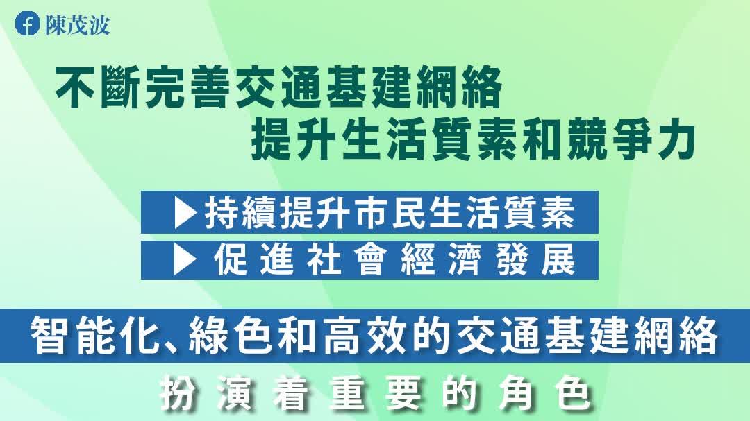 陳茂波指出,持續提升市民生活質素、促進社會和經濟發展,智能化、綠色和高效的交通基建網絡扮演着重要的角色;它也提升香港整體競爭力,包括加強香港與內地特別是粵港澳大灣區的經濟融合,是積極對接國家發展戰略的重要部分。英國《Time Out》雜誌於2025年進行指標調查,由當地人對當地公共交通,包括巴士、鐵路及電車等作出評分,其中香港的公共交通系統全球排名第一。而在國際諮詢公司聯同美國大學制定的《城市流動就緒指數2024》,香港的公共交通系統也在眾多國際大城市中排名第二、綠色運輸系統更是亞洲第一。不少訪港旅客及曾到外地的朋友,也高度讚許香港交通系統的便捷高效。事實上,《世界競爭力年報》《國際金融中心指數》等排名,亦把交通網絡納入為評估不同地方競爭力的因素之一。
