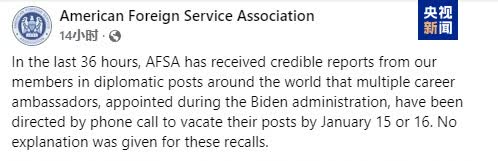 據央視新聞報道,美國外交人員工會組織外交人員協會當地時間20日在社交媒體上發表聲明說,多名在拜登政府時期任命的美國駐外大使被特朗普政府要求在明年初離職。