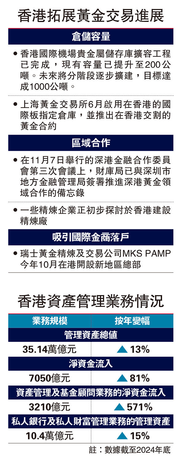 財庫局於今年11月與深圳市地方金融管理局簽署合作備忘錄,共同推進深港黃金領域合作,實現兩地黃金產業優勢互補。許正宇介紹,深圳可提供高質黃金冶煉服務,未來可構建「香港進口─深圳冶煉─再出口海外」的聯動模式,吸引海外黃金精煉商來港,服務全球及區域市場。