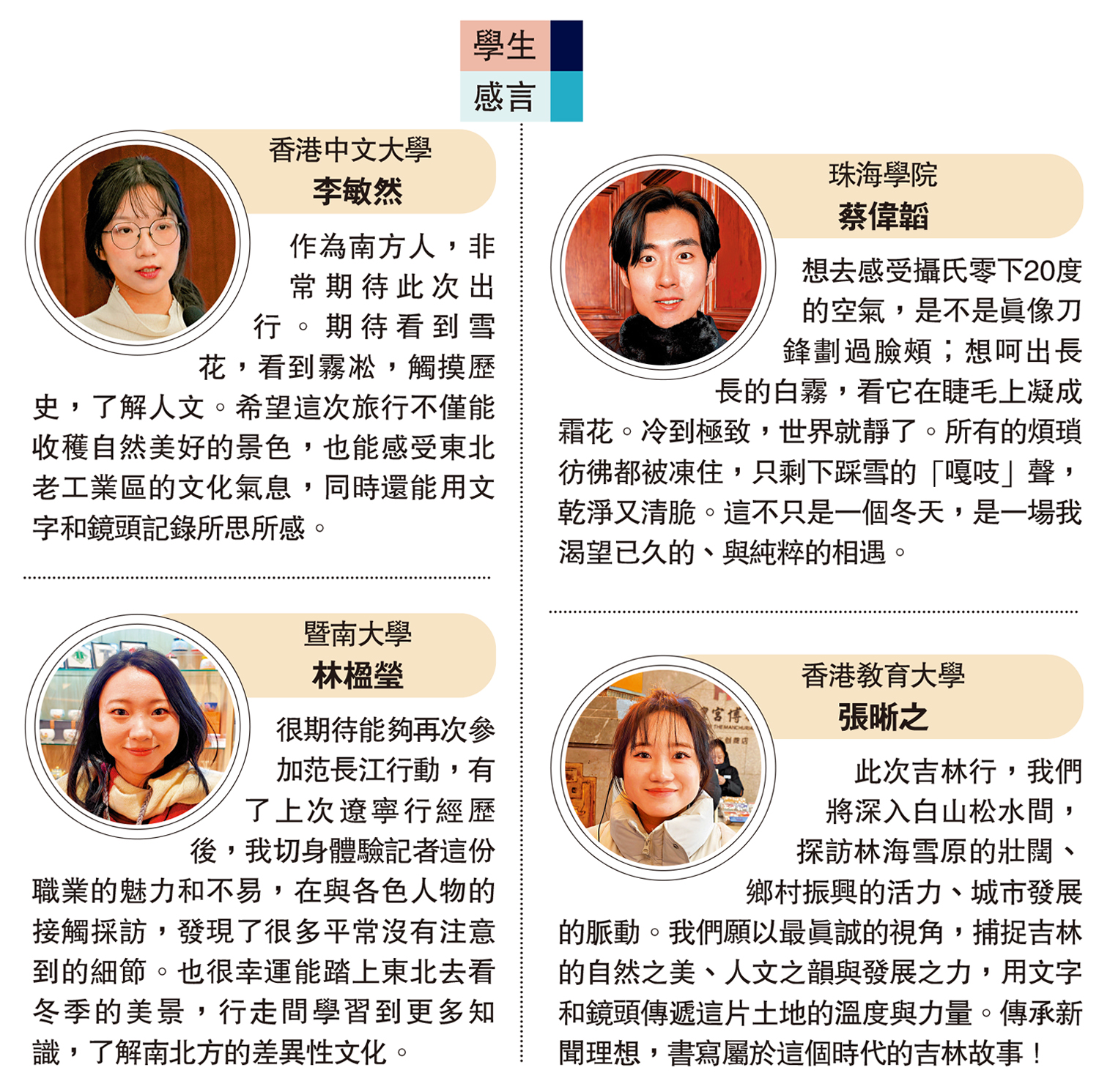 來自香港中文大學新聞與傳播學系的李敏然作為香港學生代表也分享道,此行是一場對新聞初心的追尋與踐行。范長江先生「記者,永遠在路上」的精神,將照亮我們在吉林的每一個日夜:在冰雪天地間記錄歡笑與活力,在工廠車間裏捕捉創新與蛻變;從歷史遺跡中反思過去,在媒體前沿眺望未來。