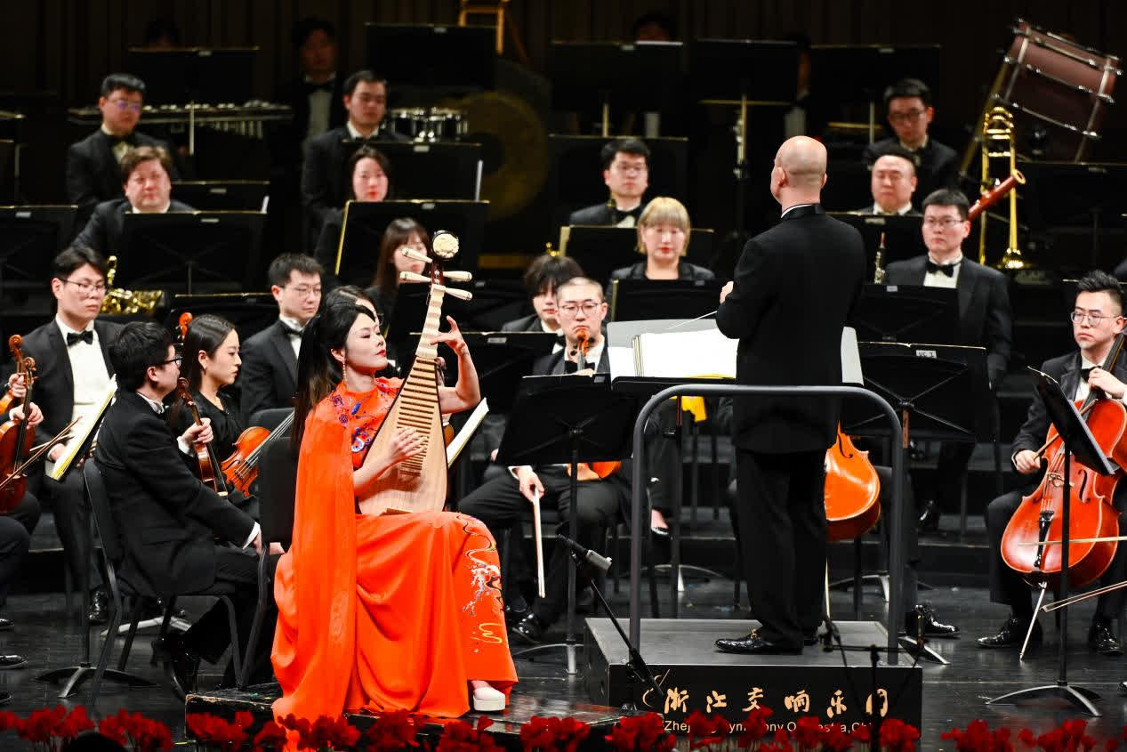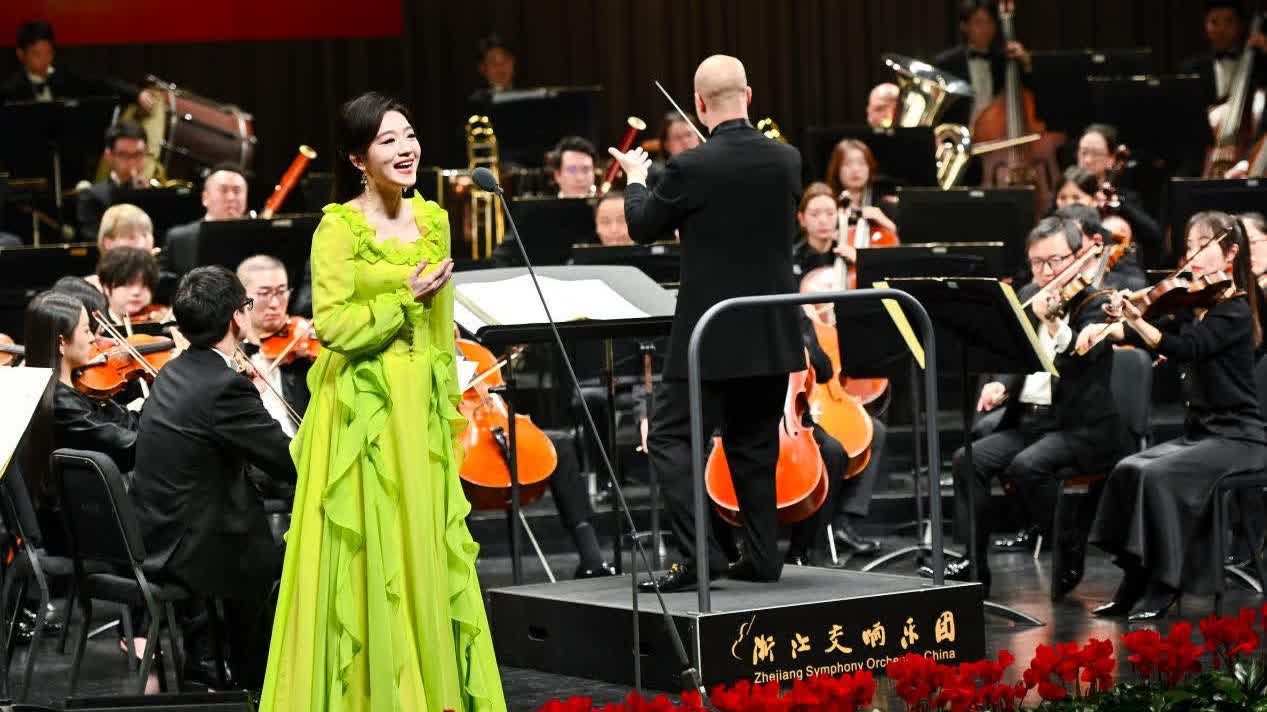 音樂會以浙江交響樂團演奏的《魯斯蘭與柳德米拉》序曲激昂開篇。隨後,入圍決賽的浙音民族室內樂團青年演奏家樓琳,以古箏協奏《望雲賦》勾勒出一幅情感綿長、意境深遠的音畫篇章。聲樂歌劇系青年教師沈佳瑜演唱的《愛永在》(選自原創歌劇《沂蒙山》)深情動人,詮釋了烽火歲月中的摯誠與堅貞。獲第八屆金鐘獎並再次入圍決賽的國樂系副教授楊婧演奏的琵琶協奏《絲路飛天》,在傳統語彙與現代技法間架起時空橋樑,勾勒出跨越古今的藝術脈絡。