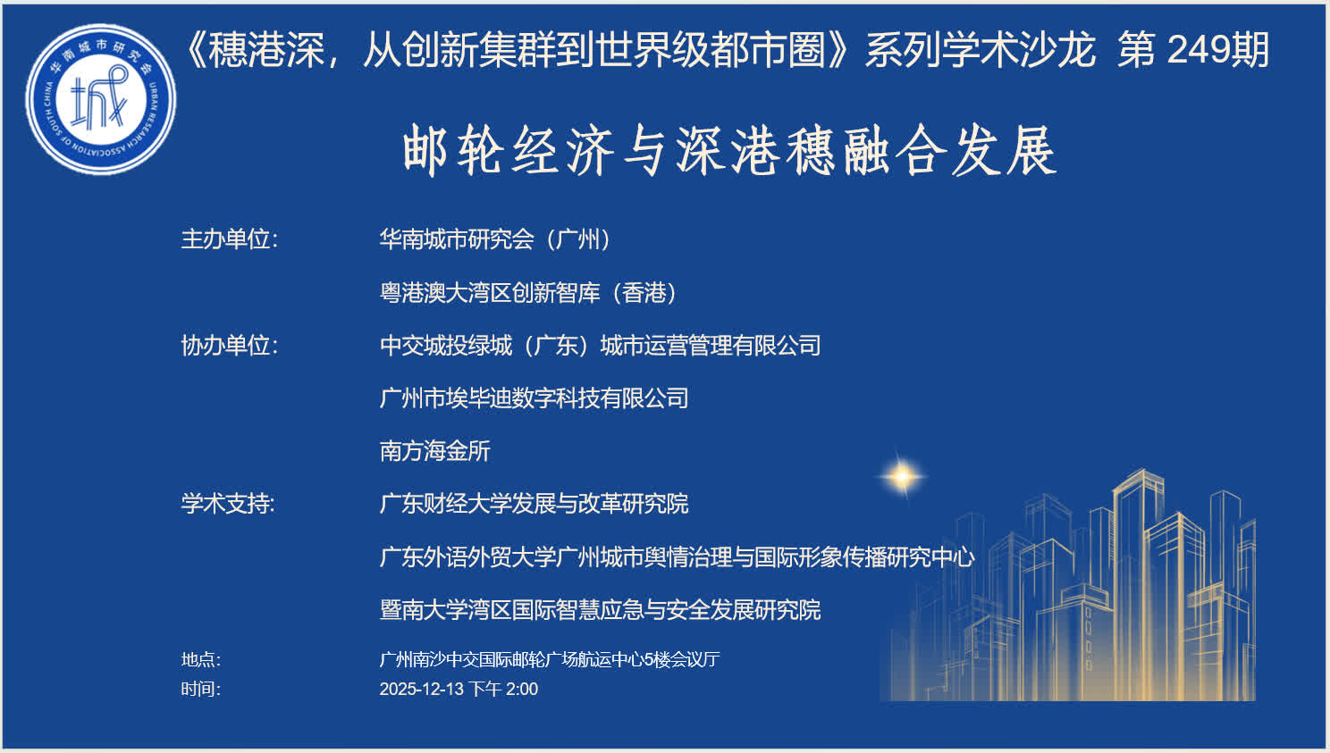 近日,《穗港深:從創新集群到世界級都市圈》系列學術沙龍第249期在廣州南沙舉辦。本期沙龍以「郵輪經濟與穗港深融合發展」為主題,由華南城市研究會(廣州)、粵港澳大灣區創新智庫(香港)主辦,與會專家從產業協同、空間整合與規則銜接等角度展開深入討論。