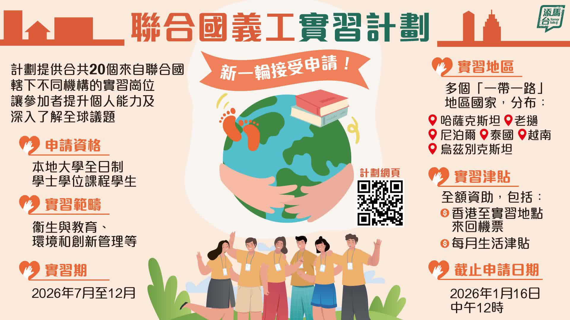 新一輪「民青局—聯合國義工實習計劃」現正接受申請,為本地大學生提供到聯合國轄下不同機構位於海外的服務單位,進行為期六個月義務實習的寶貴機會。看圖了解詳情。