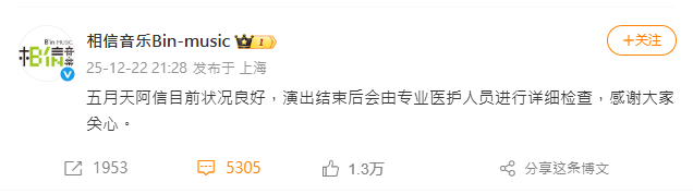 之後,相信音樂Bin-music發文替阿信報平安:「五月天阿信目前狀況良好,演出結束後會由專業醫護人員進行詳細檢查,感謝大家關心。」