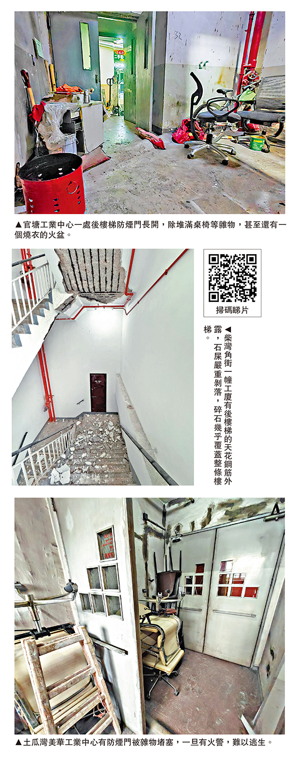 (大公報 記者 盛德文、張真)舊工廈劏房越劏越多,惟近年工廈火警時有發生,部分造成人命傷亡,消防隱患不容忽視!大公報記者近日到觀塘、紅磡、荃灣等多處工廈了解情況,發現除了劏房林立,普遍存在各種消防隱患和安全問題,包括部分通道曲折迴旋如迷宮,走火梯常被雜物、卡板、紙皮等易燃物堵塞,後樓梯石屎嚴重剝落,防煙門長開或失修變形無法打開等。有商戶甚至在擺滿雜物的後樓梯用火盆燒衣,危機重重。