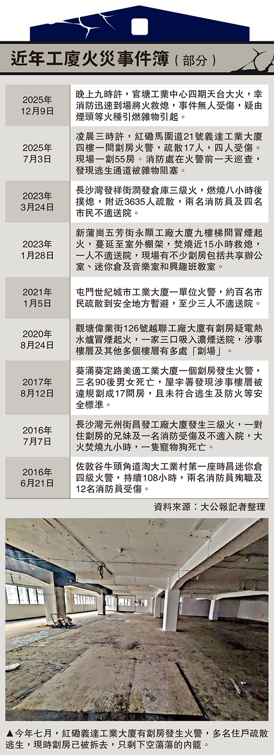 工廈改建成為「劏場」,甚至用於住宅用途,增加消防風險。香港工程學會消防分部發言人、歐家豪工程師(委員會成員)指出,工業大廈的設計、規範和建造,只擬作工業用途,工廈內會有不同的工業活動,包括儲存危險及易燃物品,市民不宜在工廈內居住;工業樓宇單位被改建為多間細單位,亦可能涉及違例建築工程,假如採用非耐火的間隔,甚至改動原有耐火間隔,一旦發生火警,後果可以相當嚴重。