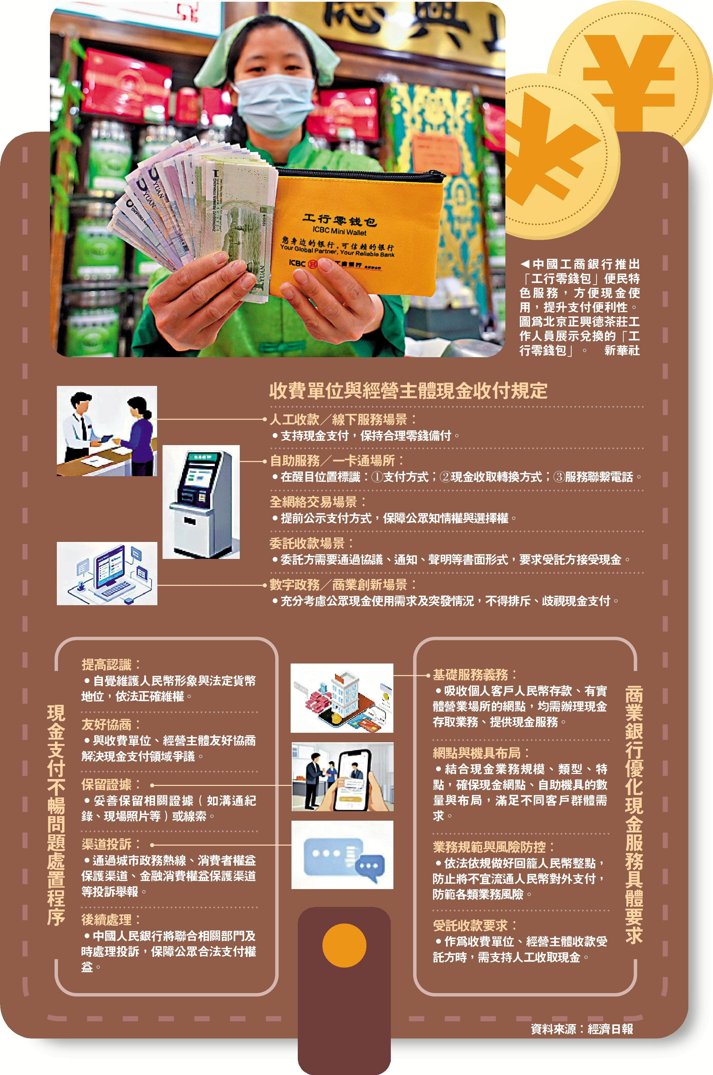 大公報綜合新京報、央視新聞報道,買東西支付現金遭商家拒絕?未來遇到這種情況,消費者可以進行維權。12月19日,人民銀行會同國家發展改革委、金融監管總局制定發布了《人民幣現金收付及服務規定》(以下簡稱《規定》),自2026年2月1日起施行。