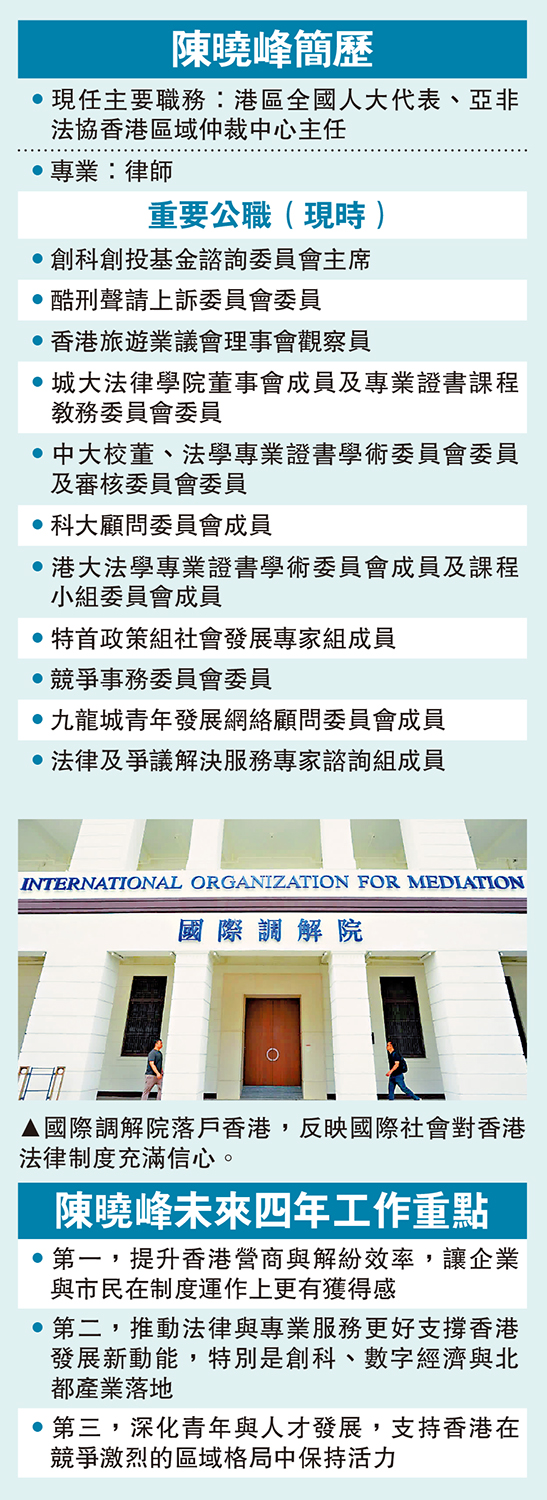 (大公報 記者 李慧妍)「我認為,從專業走向公共服務並非僅是『換一個崗位』,而是以另一種方式,讓專業更直接服務社會需要。」新一屆立法會選舉中,法律界議員由身兼港區全國人大代表的自由黨陳曉峰勝出,奪得1543票。他表示,未來在立法會的工作將以「法律產業化+法律科技」為抓手,推動多元解紛機制與司法程序順暢銜接,提升商事爭議處理效率,以及吸引國際機構與業務在本港落地。
