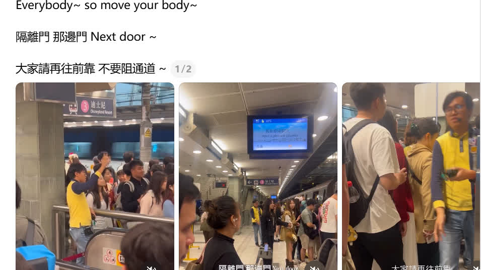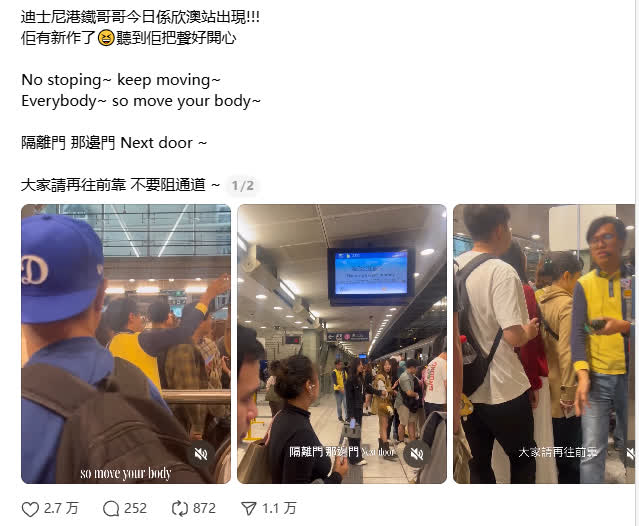 大公文匯網報道,早前因在港鐵迪士尼站以廣東話、普通話及英語,獨特「Rap式」分流乘客一炮而紅,被網民冠以「港鐵Rapper」稱號的前線職員Hinson,又有新作品喇!昨日(22日),有網友在社交媒體發布視頻,畫面中Hinson正在港鐵迪士尼站用普通話引導乘客出站。