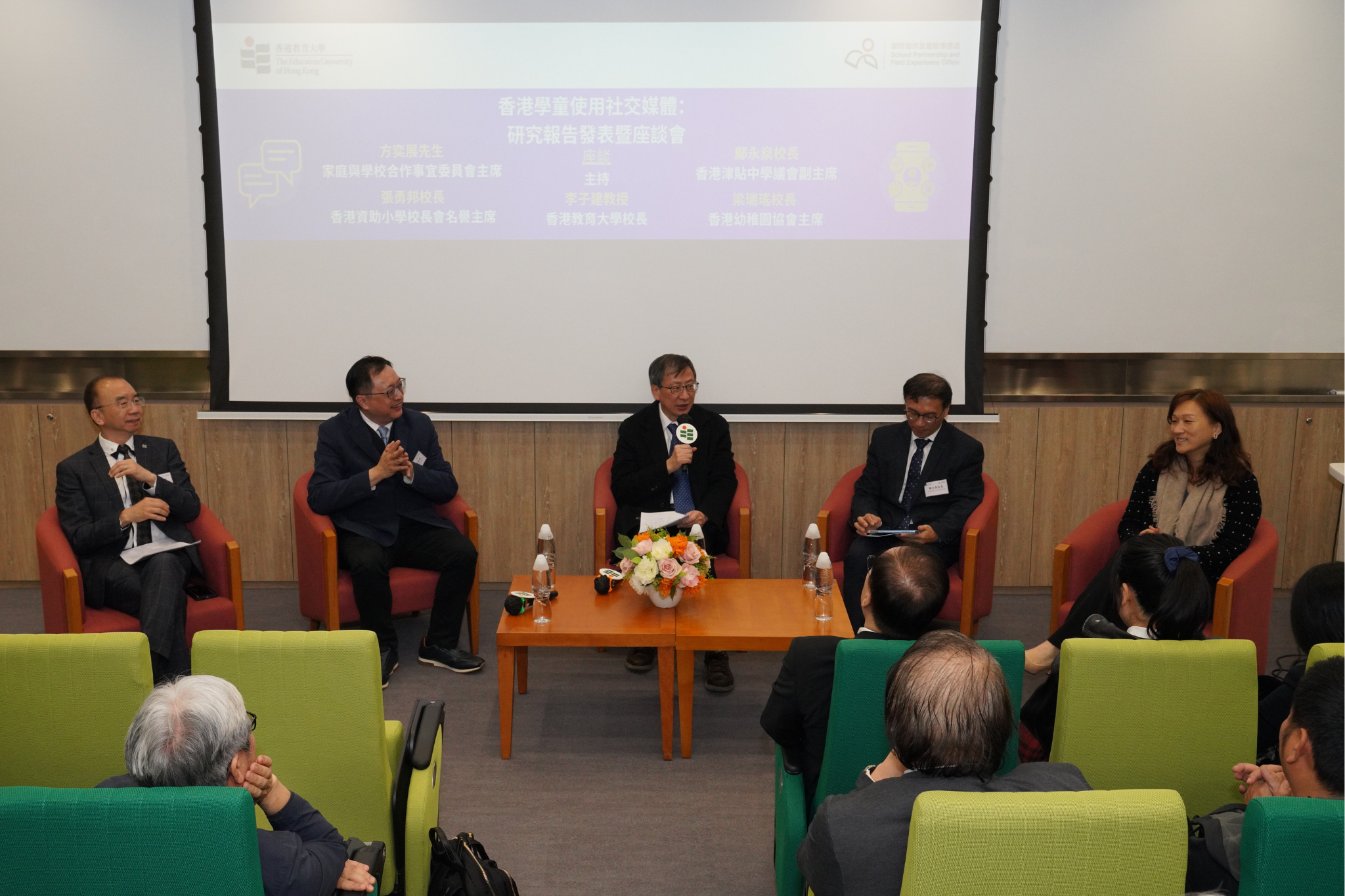 座談環節由教大校長李子建教授主持,邀得多位教育界代表,包括家庭與學校合作事宜委員會主席方奕展先生、香港津貼中學議會副主席鄺永燊校長、香港資助小學校長會名譽主席張勇邦校長及香港幼稚園協會主席梁瑞瑤校長,從家長角色、學校教育及政策、學童健康資訊量、數碼素養教育、企業社會責任等多個角度,共同探討中小學及幼兒教育在培養學童適當使用社交媒體方面的角色。