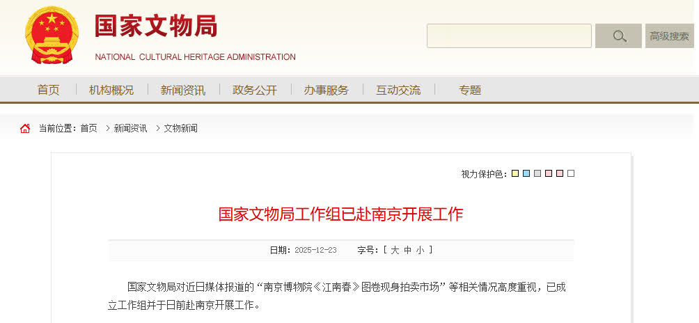 大公文匯網綜合報道,國家文物局對近日媒體報道的「南京博物院《江南春》圖卷現身拍賣市場」等相關情況高度重視,已成立工作組並於日前赴南京開展工作。