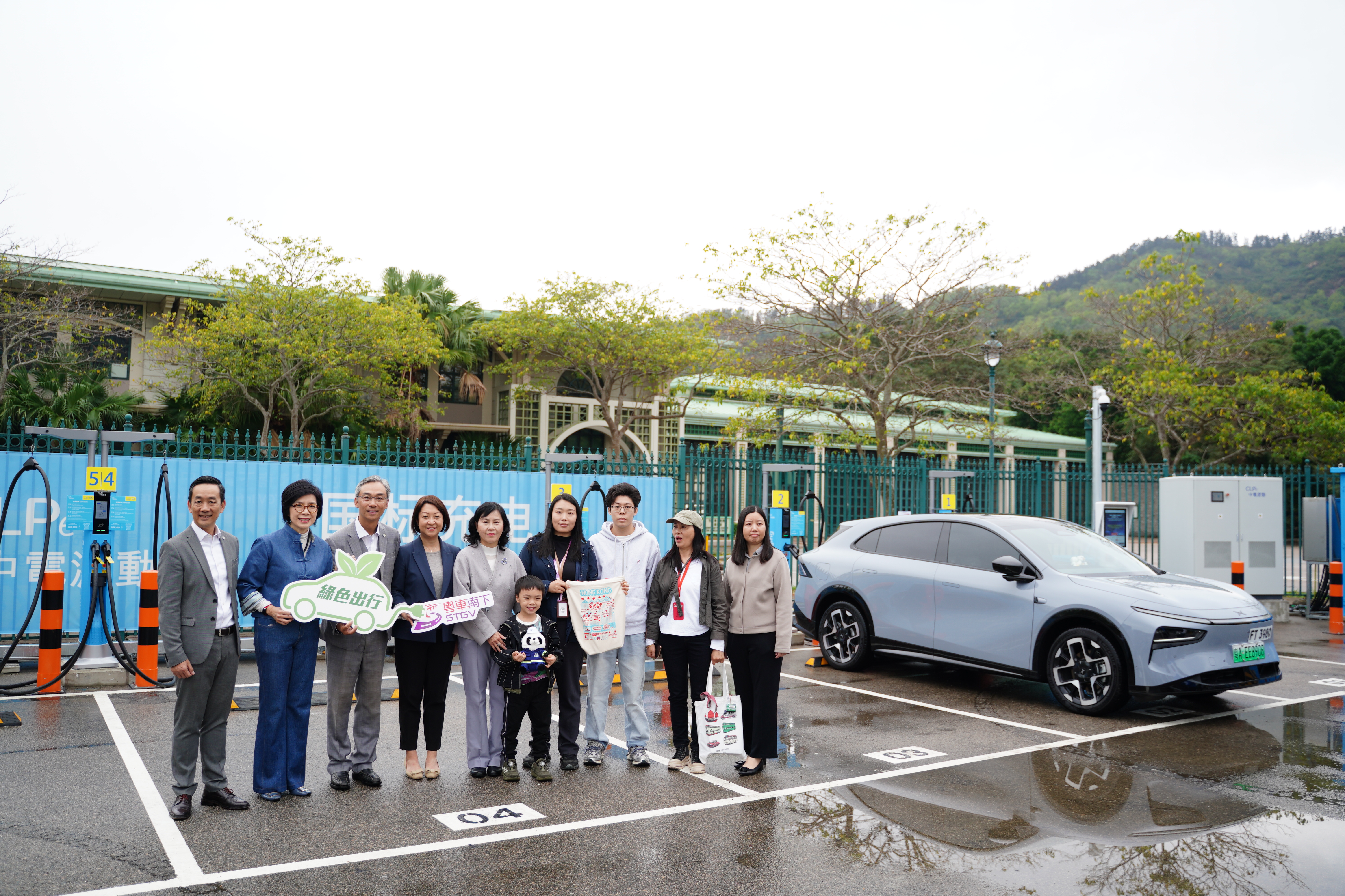 運輸及物流局局長陳美寶、運輸署署長李頌恩及中電源動集團總裁吳永豪今日在現場,迎接首批使用充電站的粵車旅客。