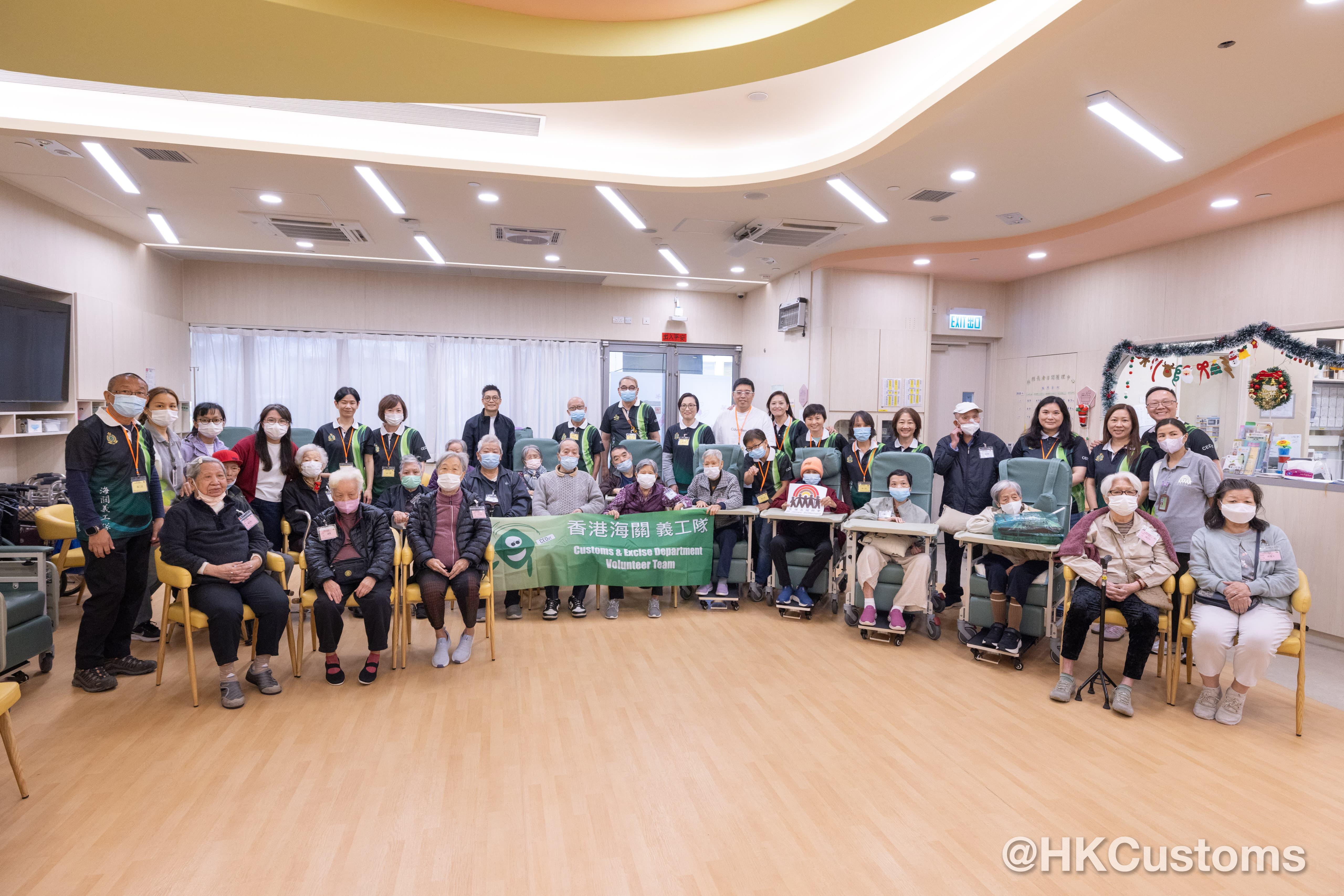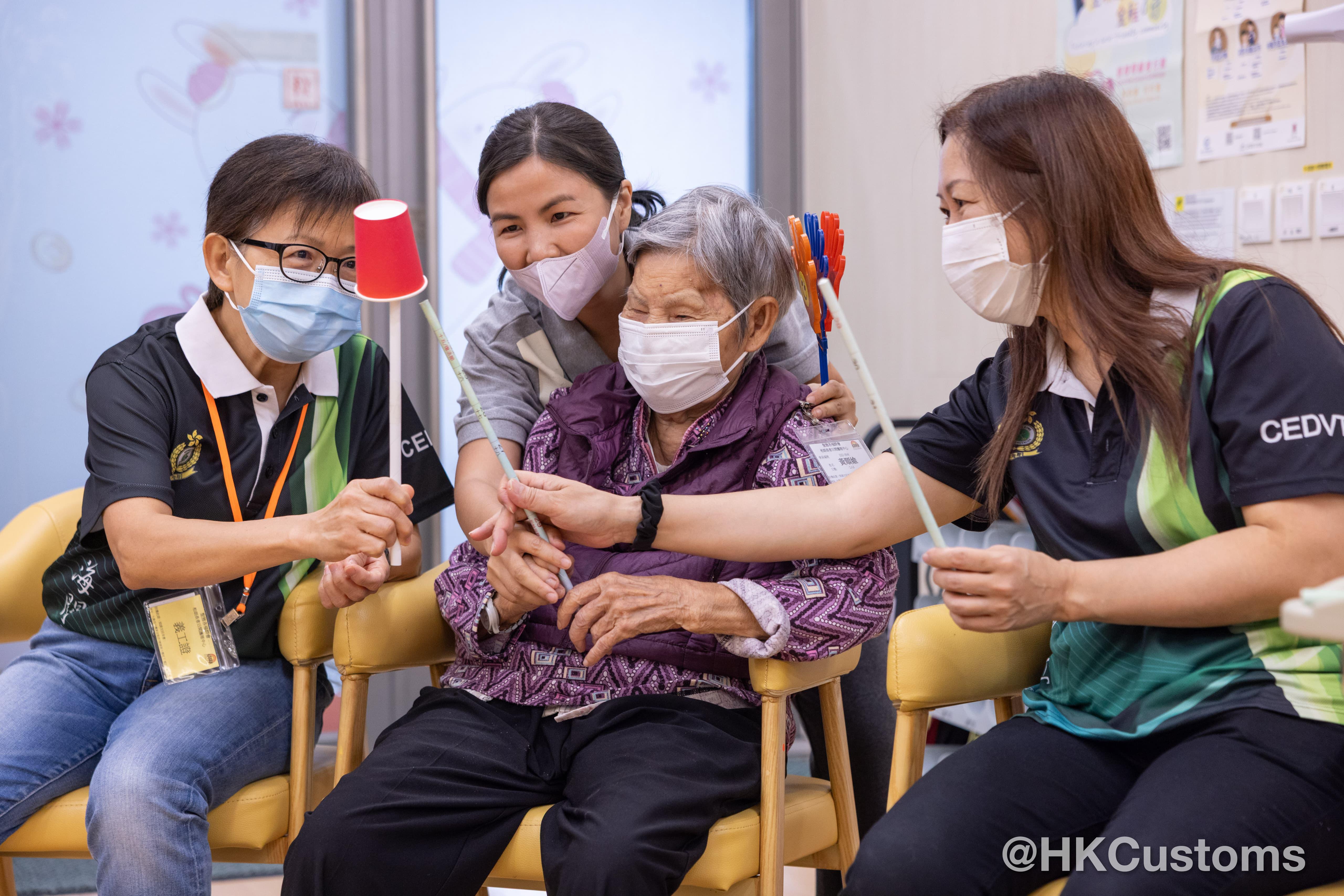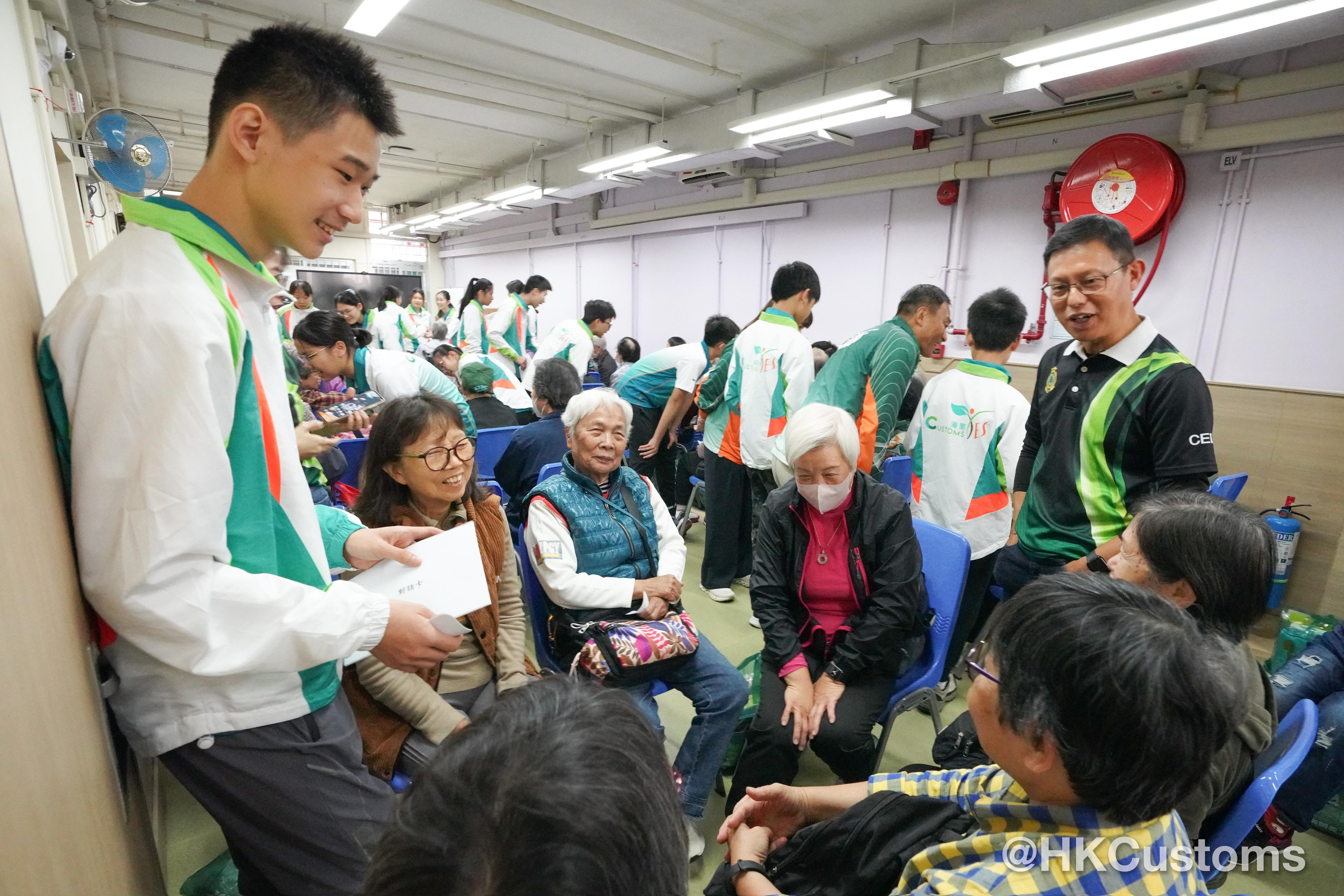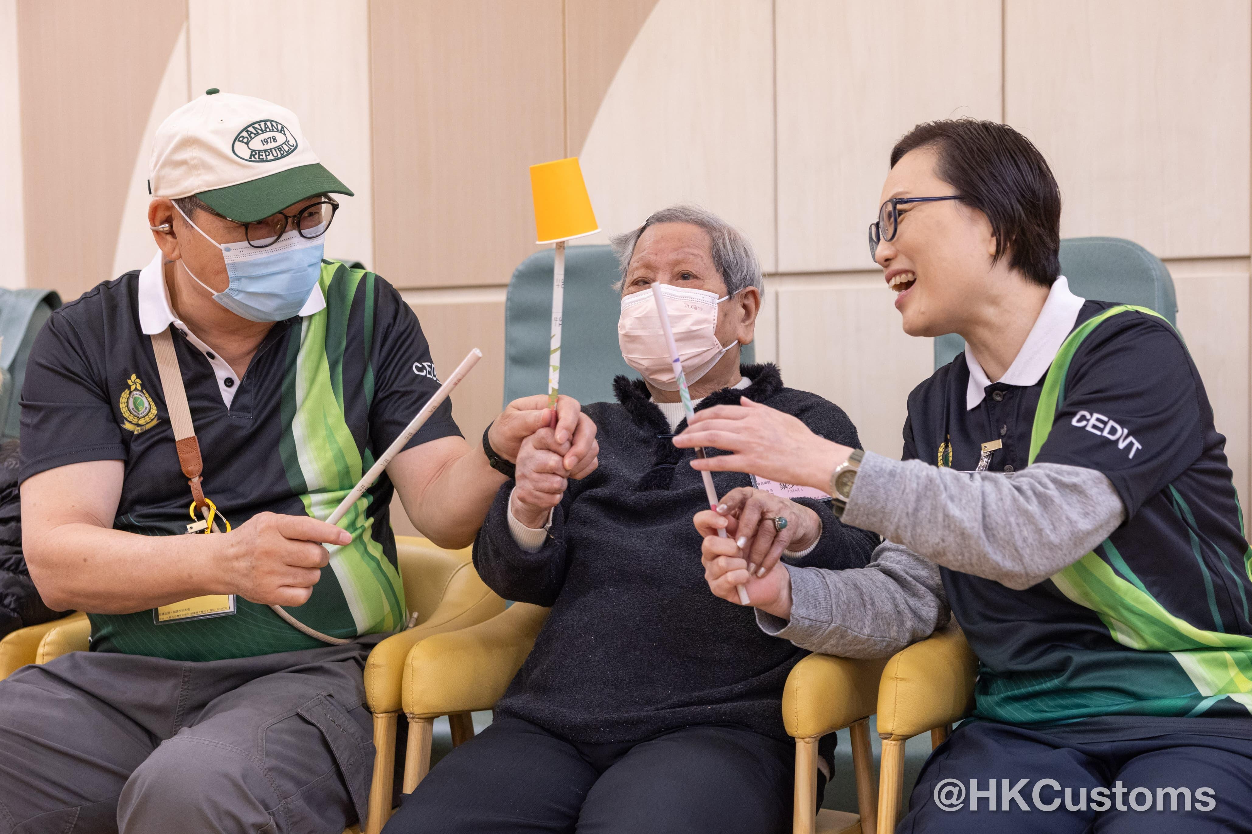 香港海關副關長(管理及策略發展)許劍及助理關長(行政及人力資源發展)黃蕙荃分別帶同Customs YES年青隊員及義工同事到訪長者中心,與老友記一同玩遊戲。