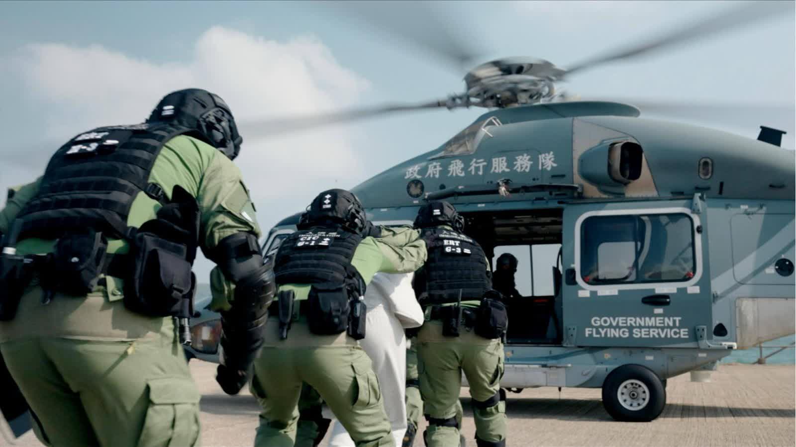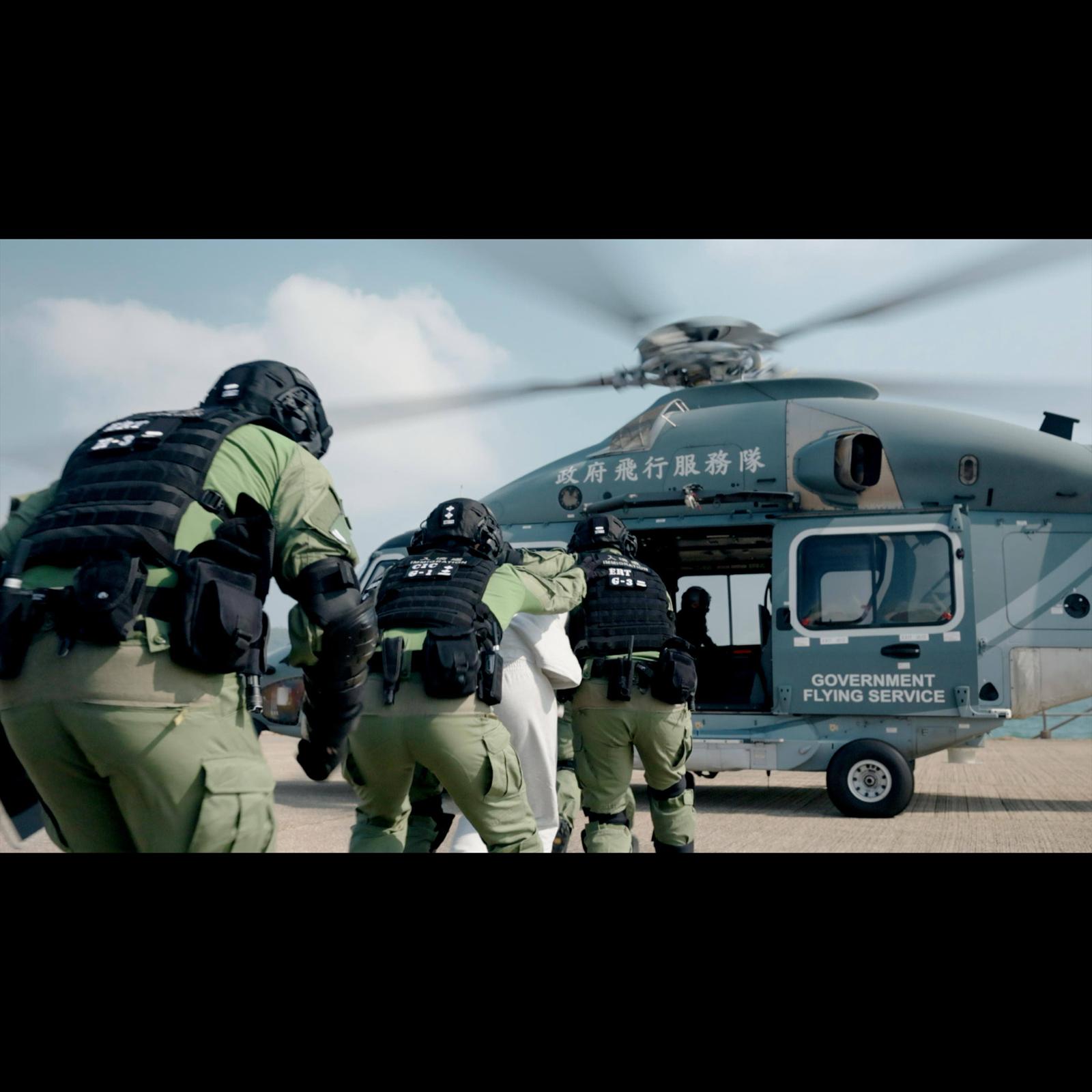 演習模擬中心人員在押送一名高保安風險羈留人士的時候,因惡劣天氣導致陸路交通受阻,中心指揮人員隨即啟動與政府飛行服務隊的協作機制,改用直升機進行空中押送,確保安全迅速地把羈留人士押返中心。