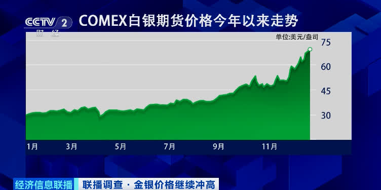 與此同時,國際銀價也維持漲勢。紐約白銀期貨以及倫敦現貨白銀價格均升破每盎司72美元關口,同樣創下歷史新高。