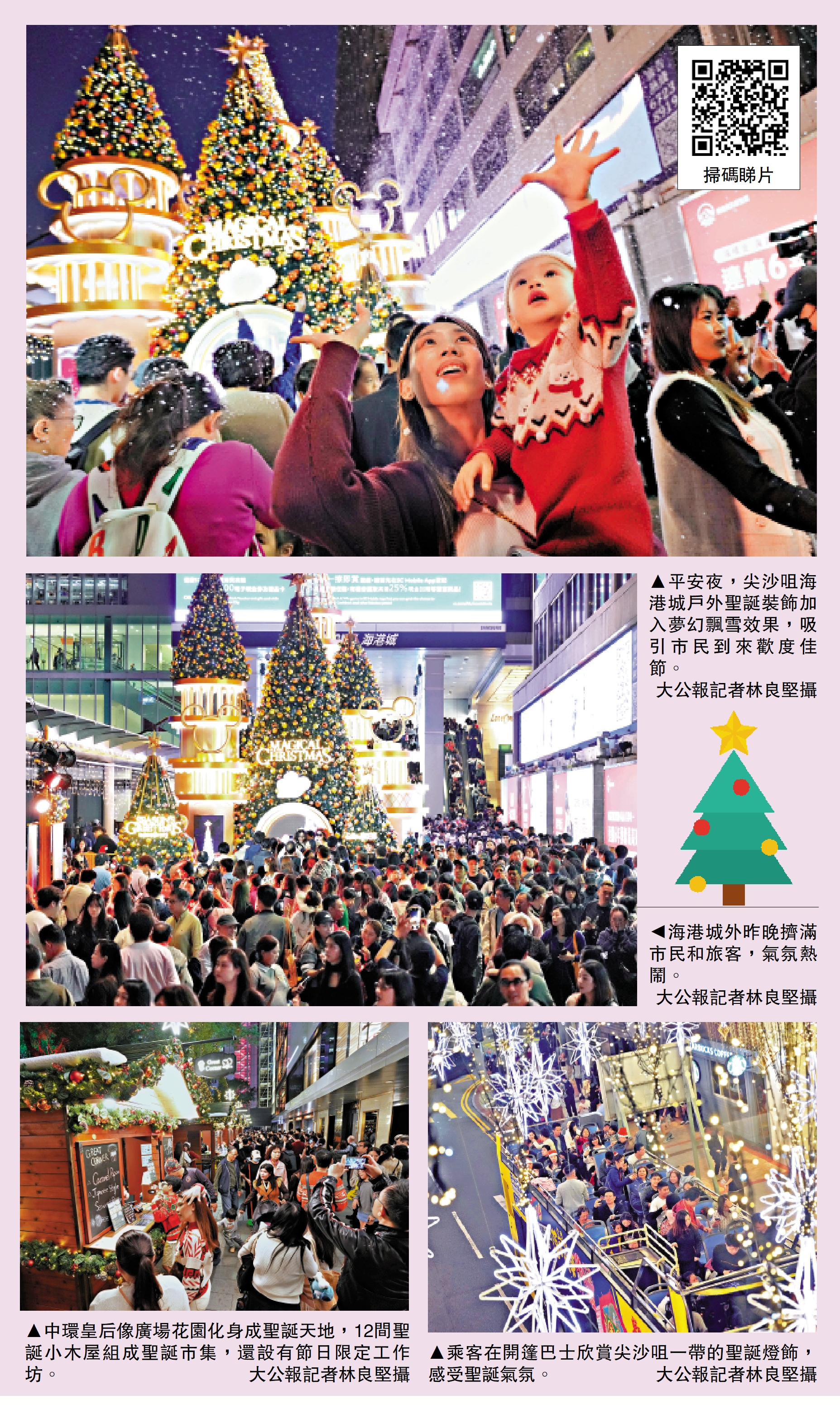 (大公報記者 易曉彤、王亞毛)今日是聖誕節,昨晚平安夜全港各區都有聖誕活動,街上節日氣氛濃厚,中環、尖沙咀和西九文化區等地都出現人潮。入境處數據顯示,昨日截至晚上9時,超過102萬人次出入境,當中入境有近36萬人次,遊客佔近14萬人次。有旅客專程來港過聖誕,按攻略打卡多處聖誕裝置,大讚氛圍濃厚。有本地市民留港消費,花4000元買聖誕禮物,和家人朋友食聖誕大餐。