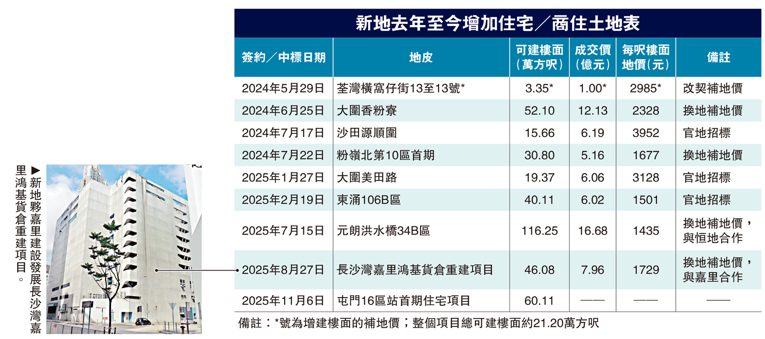 特區政府及一鐵一局成功招標的官地及發展項目共涉7幅土地,新地奪其3幅,均是住宅發展項目,可建樓面近120萬方呎。加上新地今年中在私人市場與特區政府達成兩個換地補地價的住宅項目,分別是與恒地(00012)就洪水橋新發展區內的首幅原址換地項目,以及夥嘉里建設(00683)合作的長沙灣嘉里鴻基貨倉重建項目,新地今年新增獨資及合資項目所涉可建住宅樓面暫已約282萬方呎,料可提供約5600個單位。新地去年透過買官地及補地價所吸納的4幅住宅土地,可建樓面約102萬方呎。