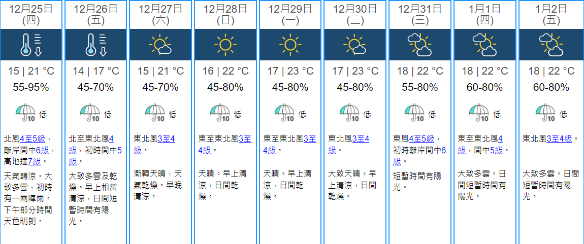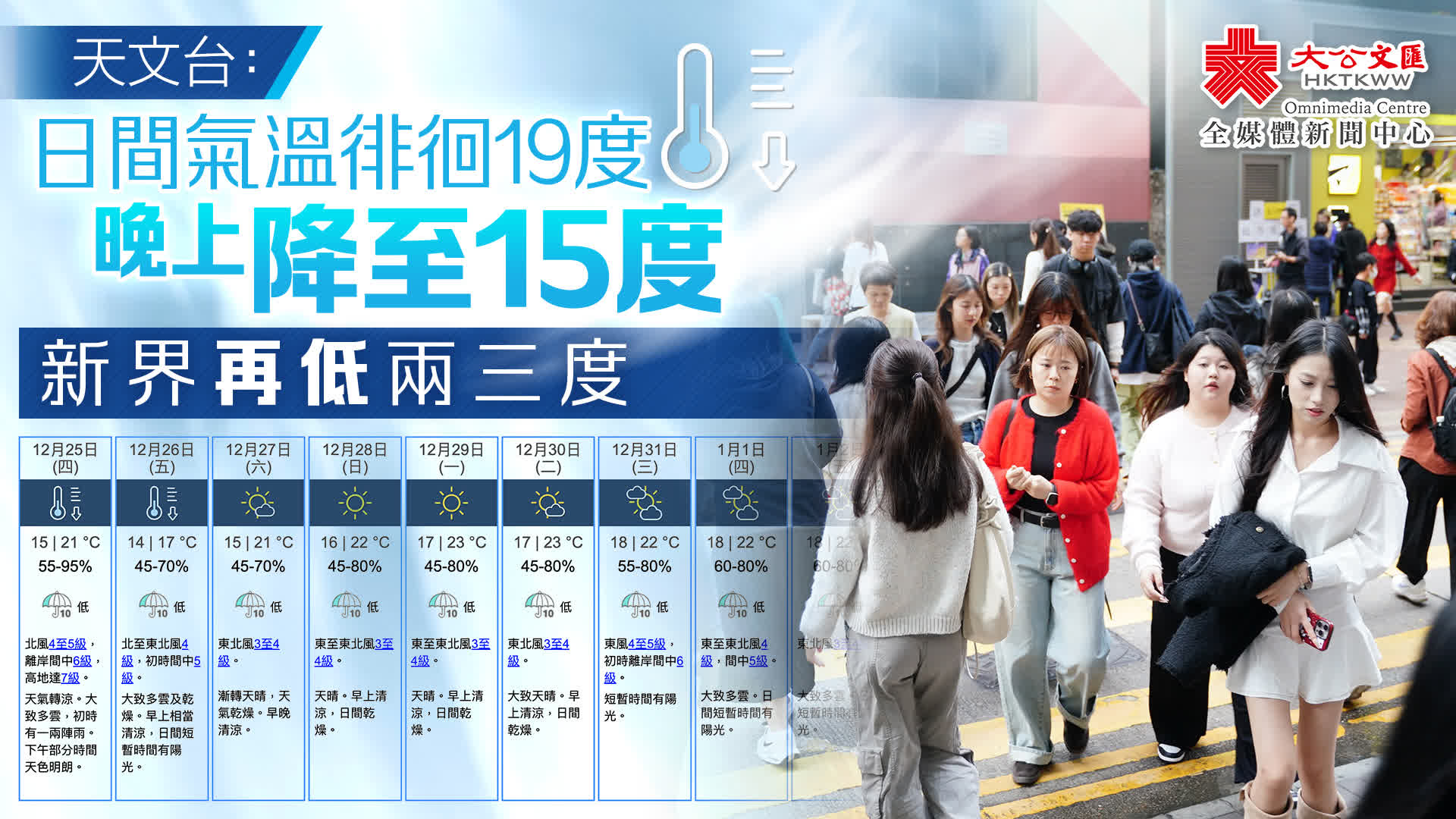 大公文匯全媒體報道,今日(25日)聖誕節,天文台表示,一股清勁至強風程度的東北季候風補充正影響廣東沿岸。同時,一道雲帶覆蓋該區。本港地區今日天氣預測大致多雲,初時有一兩陣雨。日間氣溫徘徊在19度左右。下午部分時間天色明朗。天氣轉涼。晚上市區氣溫下降至約15度,新界再低兩三度,吹和緩至清勁北風,離岸及高地間中吹強風。
