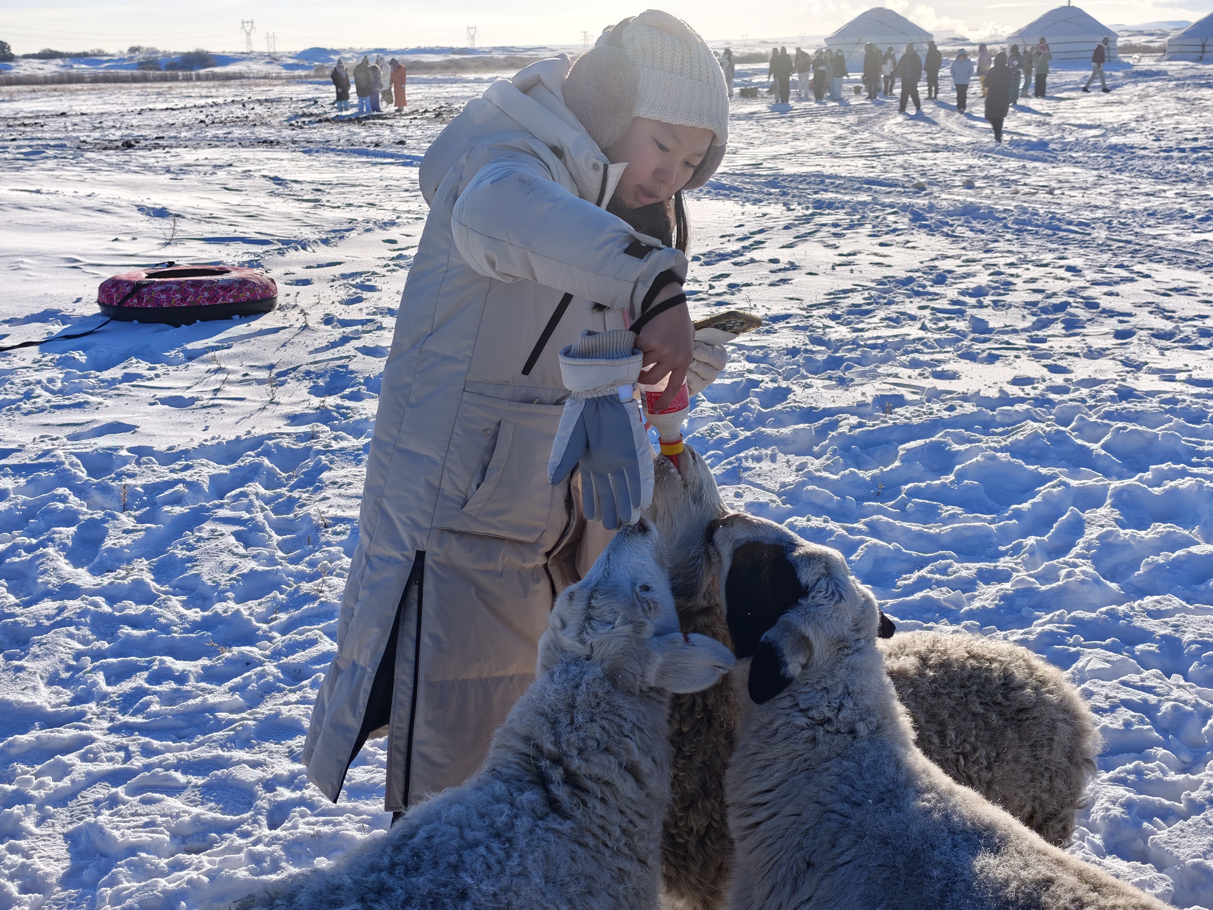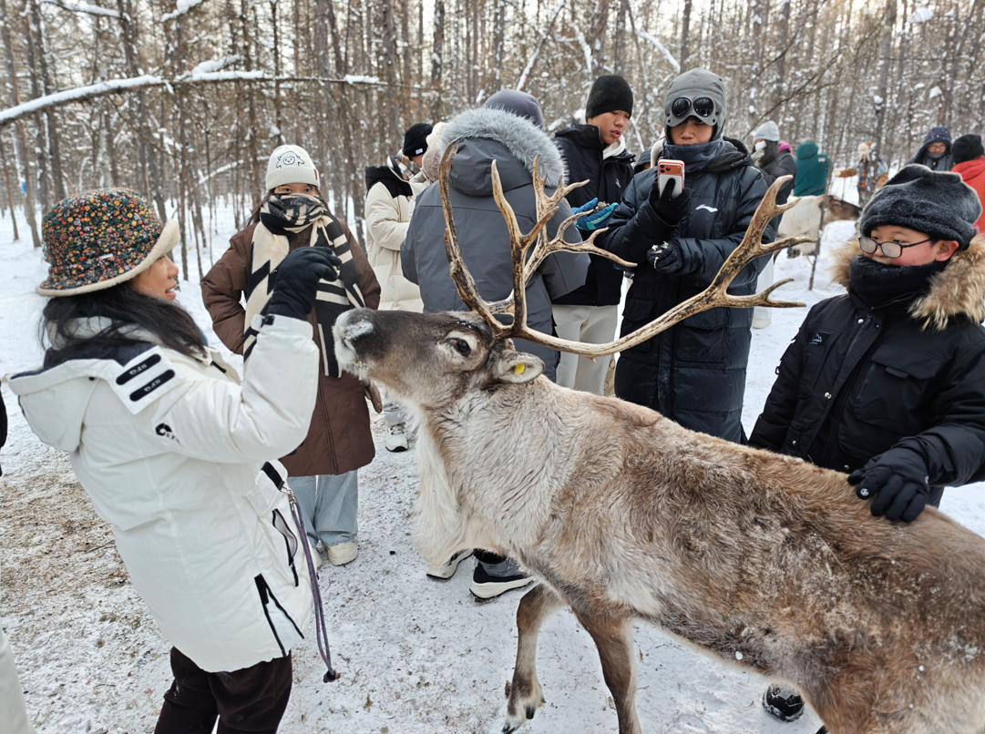 為迎接聖誕,團隊還到訪敖魯古雅使鹿部落,和「聖誕老人坐騎」馴鹿進行了近距離接觸。平安夜當天,師生團走進鄂溫克旗牧戶家庭,體驗鏟牛糞、餵羊、住蒙古包等牧民日常生活。