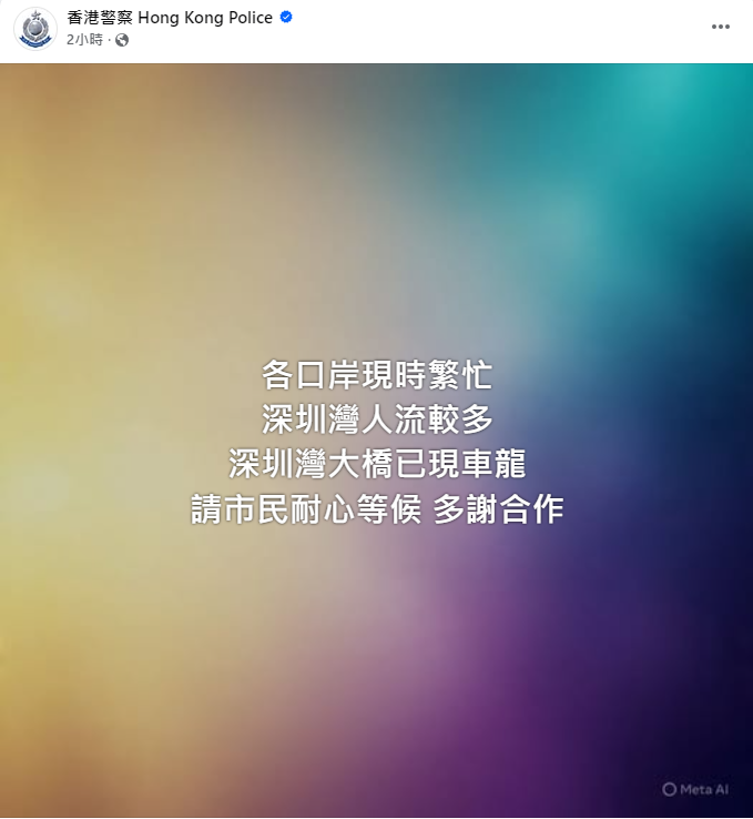 警務處在社交平台表示,各口岸現時繁忙,深圳灣人流較多,深圳灣大橋已現車龍,請市民耐心等候。