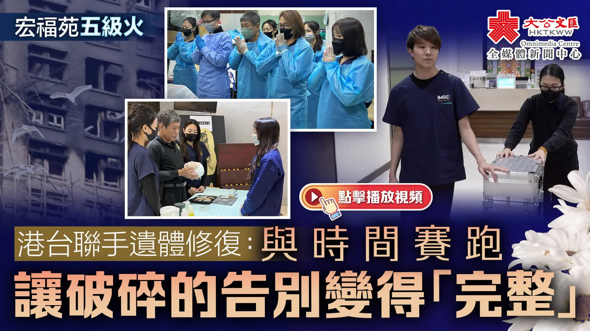 在九龍殯儀館,由香港及台灣兩地人員組成的團隊,正在與時間賽跑,齊心協力修復遇難者遺體。他們用嚴謹的態度和最溫柔的方式,希望為逝者帶去最後的尊嚴,為家屬帶去最後的慰藉。「你要讓生者看到先人最完整的容貌去送別他,他才可以安心離開。」來自台灣的知名遺體修復師郭璋成緩緩道,這便是常說的「撫生者之心,安亡者之靈」。
