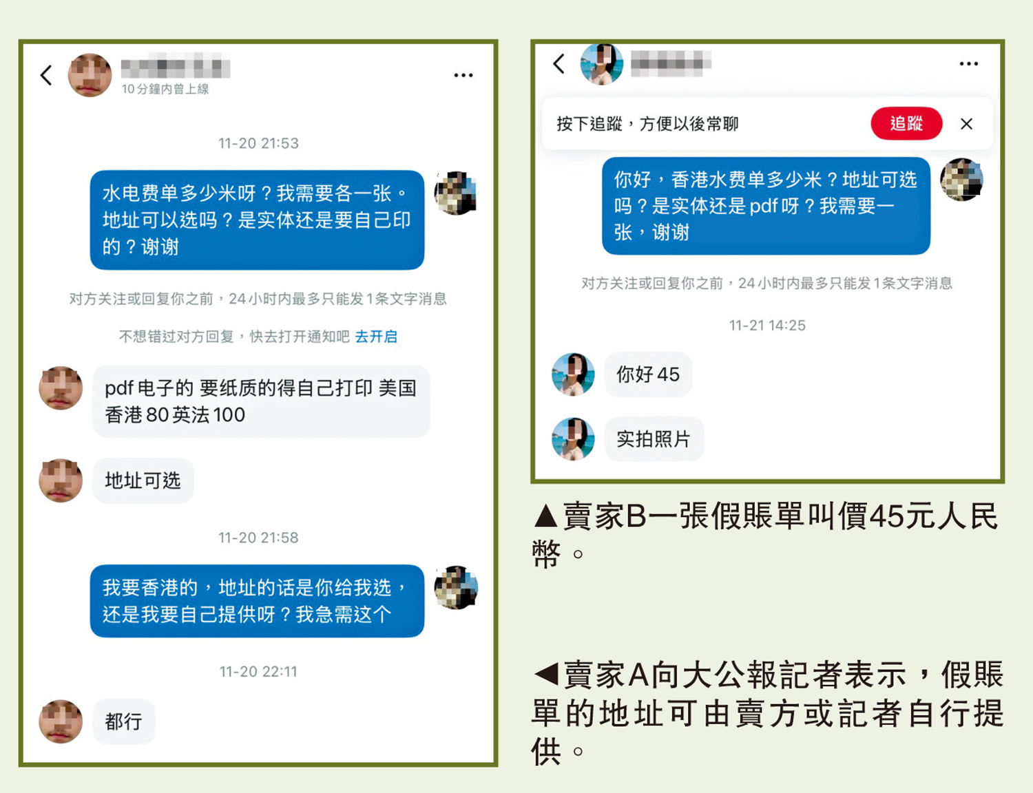 大公報記者在網上多個交易及社交平台發現有人出售香港住址證明,包括水費、電費單及銀行賬單等,提供的樣本更是幾可亂真。記者隨機找到兩個賣家查詢,賣家A表示,出售水電費單及銀行賬單,叫價80元人民幣,賬單上的地址更是可以自由選擇,如果買家不能提供,他亦能隨機幫買家提供住址。