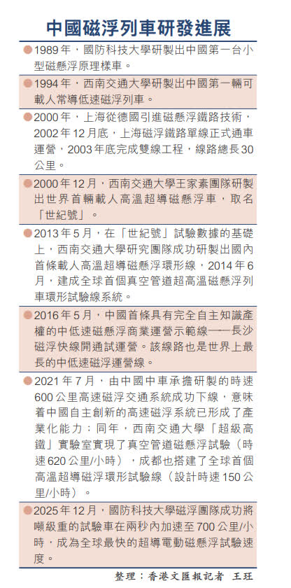 (香港文匯報記者 王玨 北京報道)國防科技大學磁浮團隊近日在磁懸浮技術領域取得重大突破,成功將噸級重的試驗車在兩秒內加速至700公里/小時,這一測試速度打破了同類型平台全球紀錄,成為全球最快的超導電動磁懸浮試驗速度。