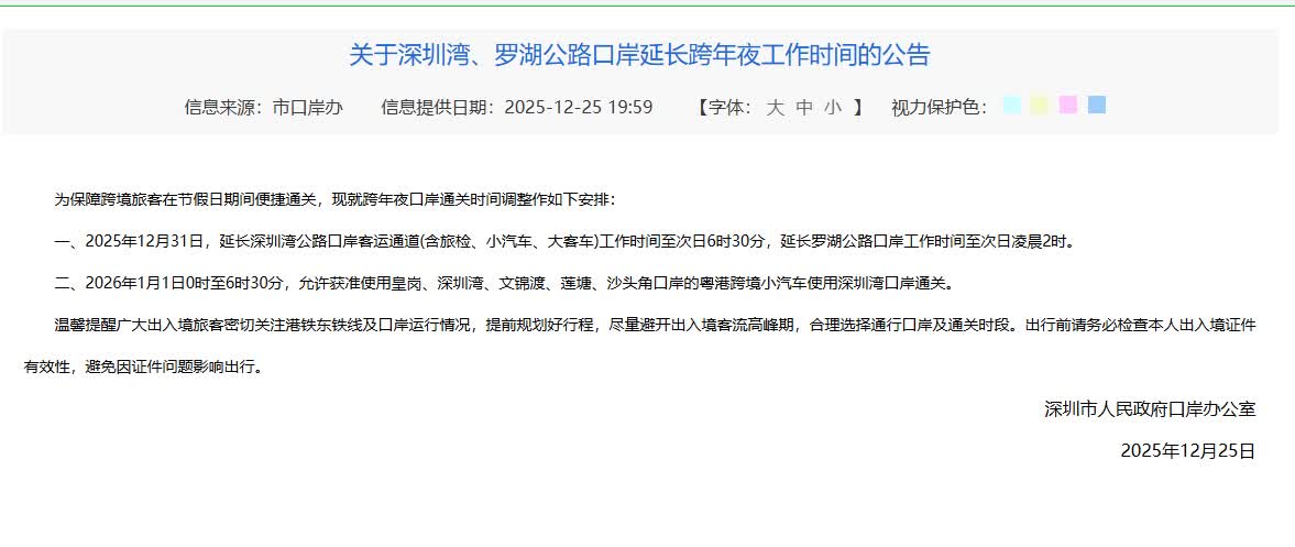 (大公文匯網 記者石華 深圳報道)記者從深圳市口岸辦獲悉,為保障跨境旅客在節假日期間便捷通關,12月31日,延長深圳灣公路口岸客運通道(含旅檢、小汽車、大客車)工作時間至次日6時30分,延長羅湖公路口岸工作時間至次日凌晨2時。