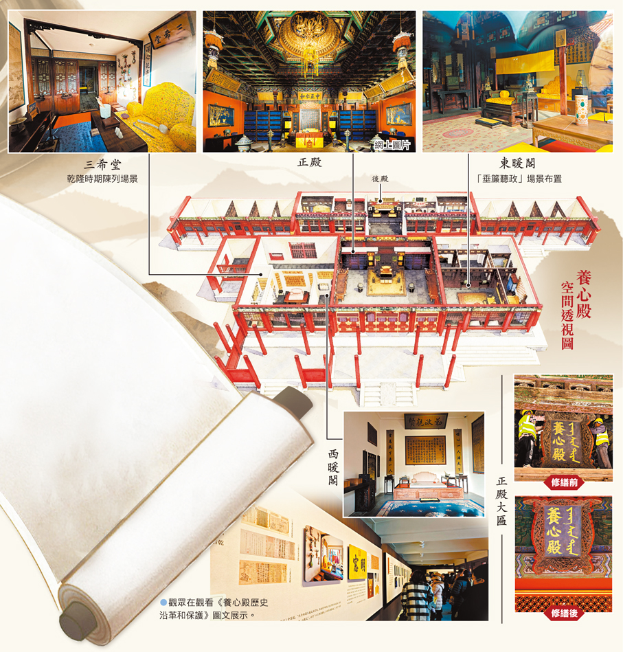 (香港文匯報記者 江鑫嫻 北京報道)經過近10年的研究性保護和系統性修繕,故宮養心殿26日重新開放。養心殿是清代八位皇帝的「起居辦公室」,這裏的原狀陳列,保留了雍正、乾隆、同治、光緒不同時期的原狀,共計布陳展品1,020件。香港文匯報記者在現場看到,室內原狀陳列的布展遵循歷史原貌,正殿寶座上方懸掛雍正御筆「中正仁和」匾,西暖閣「勤政親賢」匾額下的楹聯恢復如初,三希堂內則按記載還原了乾隆時期的陳列場景。另外,針對古建展廳光照難題,故宮科研團隊研究光纖調光系統,在保障文物安全的前提下優化觀眾觀展體驗。