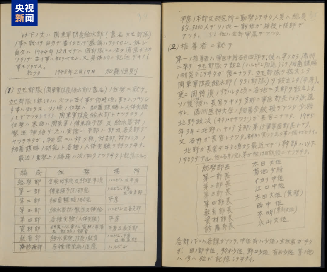 該史料原件藏於俄羅斯聯邦安全局外貝加爾邊疆區分局,由普希金科學圖書館申請解密獲取後,於今年2月將影印版捐贈到黑龍江哈爾濱侵華日軍第七三一部隊罪證陳列館,主要記載了加藤恒則1948年2月被蘇聯逮捕後親筆書寫的供述材料,包含被捕者檔案、個人信息登記表及詳細罪行陳述三部分內容,由俄文和日文材料組成,日文是親筆筆供,俄文是翻譯稿。