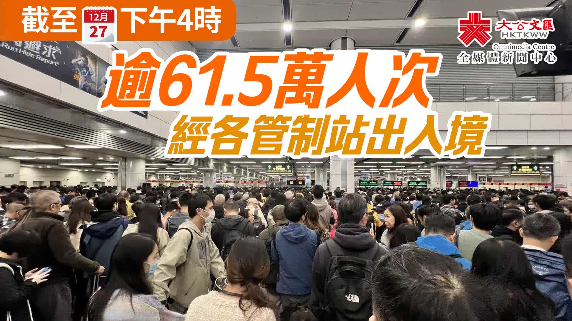 大公文匯全媒體報道,聖誕節長假期,根據入境處數字,截至今日(27日)下午4時,共有超過61.5萬人次經各管制站出入境,包括31萬多人次出境,及30萬多人次入境。