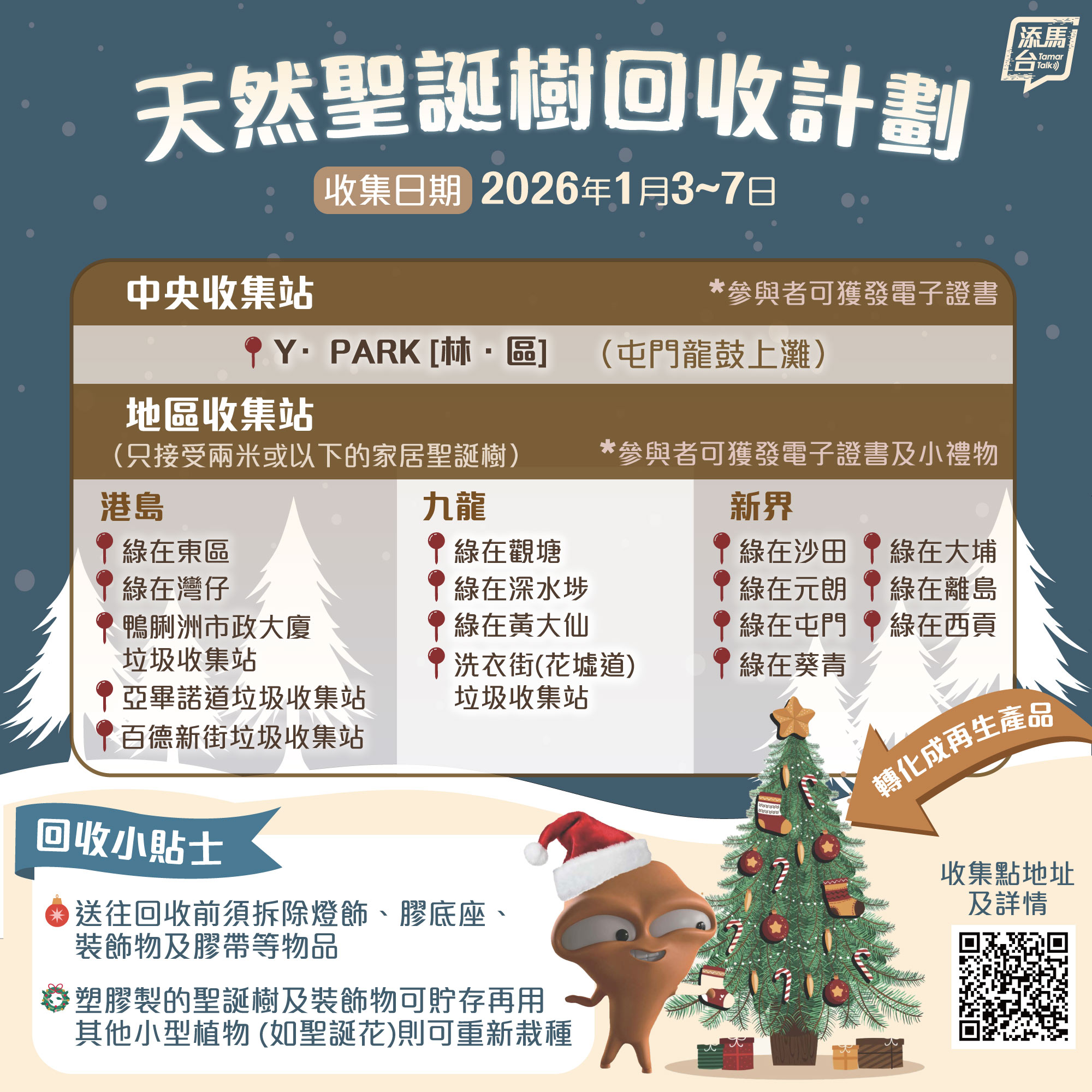 政府提醒,如在2026年1月3日前、1月8日至20日期間需要回收聖誕樹,可於辦公時間內(星期一至星期六,上午9時至下午6時,公眾假期除外)送往Y‧PARK[林‧區]回收。