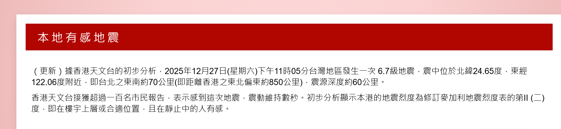 另外,本港天文台指,接獲超過一百名市民報告,表示感到這次地震,震動維持數秒。初步分析顯示本港的地震烈度為修訂麥加利地震烈度表的第II (二)度,即在樓宇上層或合適位置,且在靜止中的人有感。