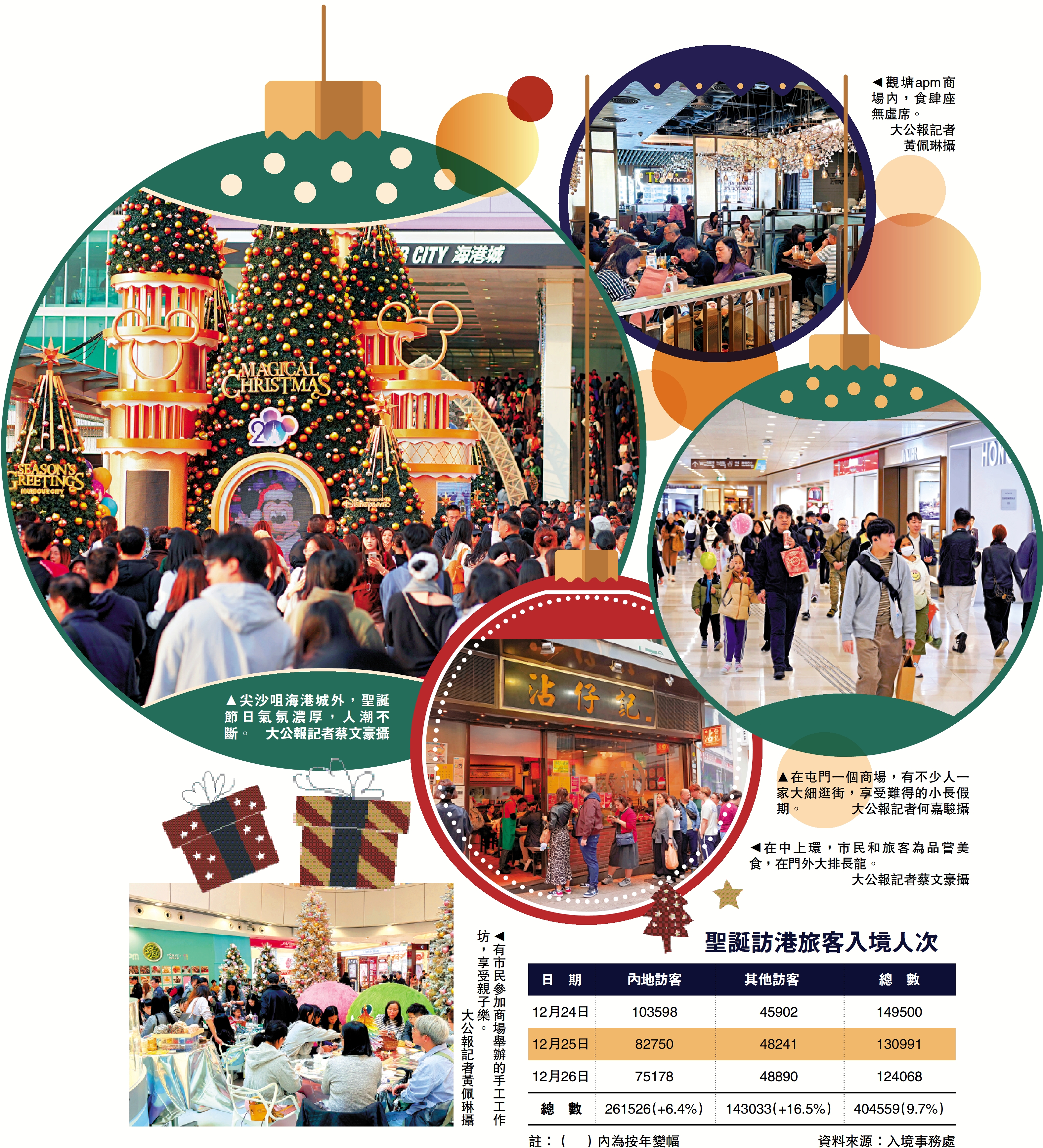 (大公報記者 黃佩琳、王亞毛)聖誕假期訪港旅客人次上升,加上留港消費的港人,市面氣氛熱鬧暢旺。入境處數據顯示,過去四日截至昨日晚上9時,各口岸累計有超過461萬出入境人次,當中由平安夜起計三日的整體訪港旅客,錄得40萬入境人次,按年增長9.7%,海外訪客錄雙位數增幅,達16.5%。