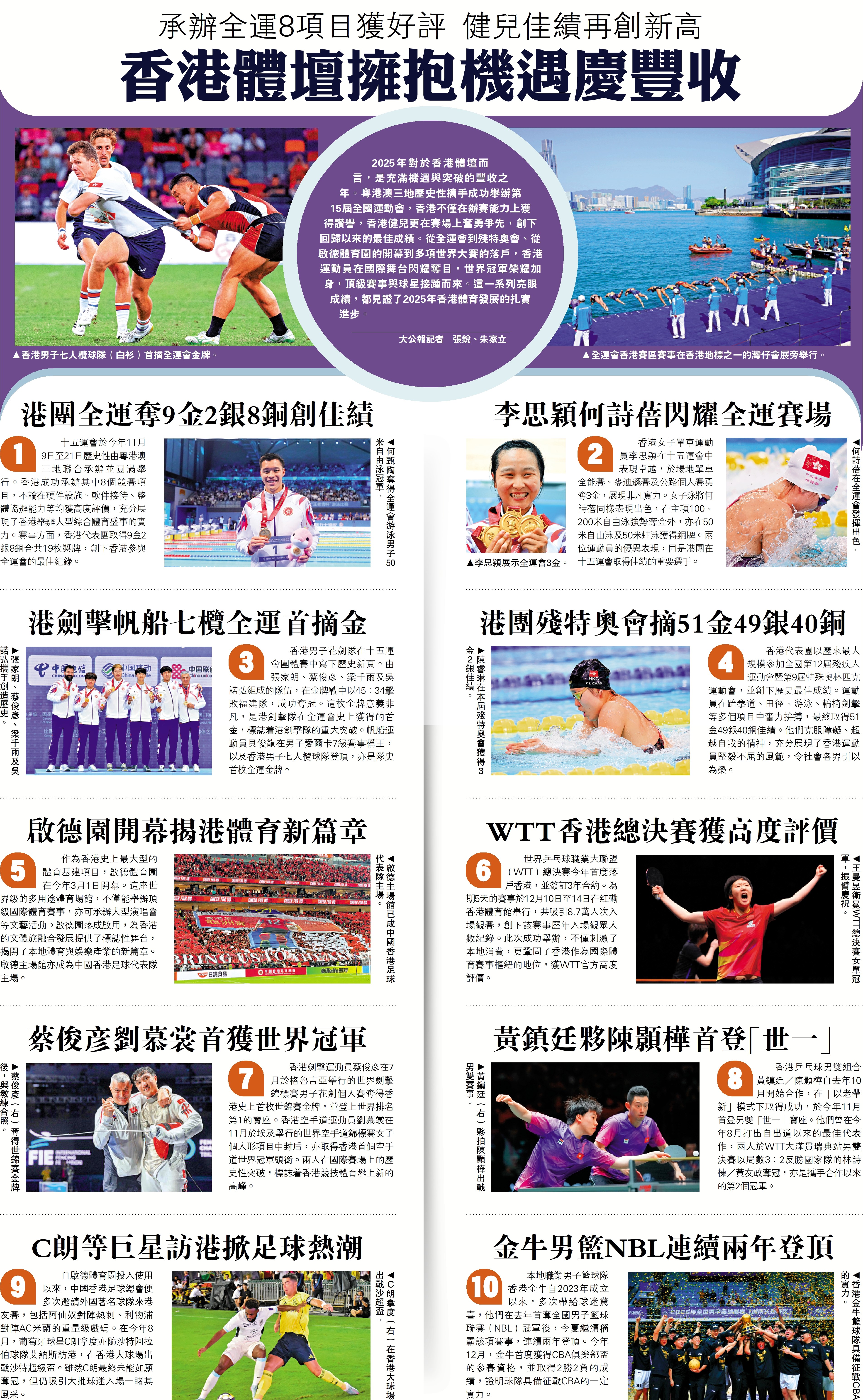 (大公報記者 張銳、朱家立)2025年對於香港體壇而言,是充滿機遇與突破的豐收之年。粵港澳三地歷史性攜手成功舉辦第15屆全國運動會,香港不僅在辦賽能力上獲得讚譽,香港健兒更在賽場上奮勇爭先,創下回歸以來的最佳成績。從全運會到殘特奧會、從啟德體育園的開幕到多項世界大賽的落戶,香港運動員在國際舞台閃耀奪目,世界冠軍榮耀加身,頂級賽事與球星接踵而來。這一系列亮眼成績,都見證了2025年香港體育發展的扎實進步。