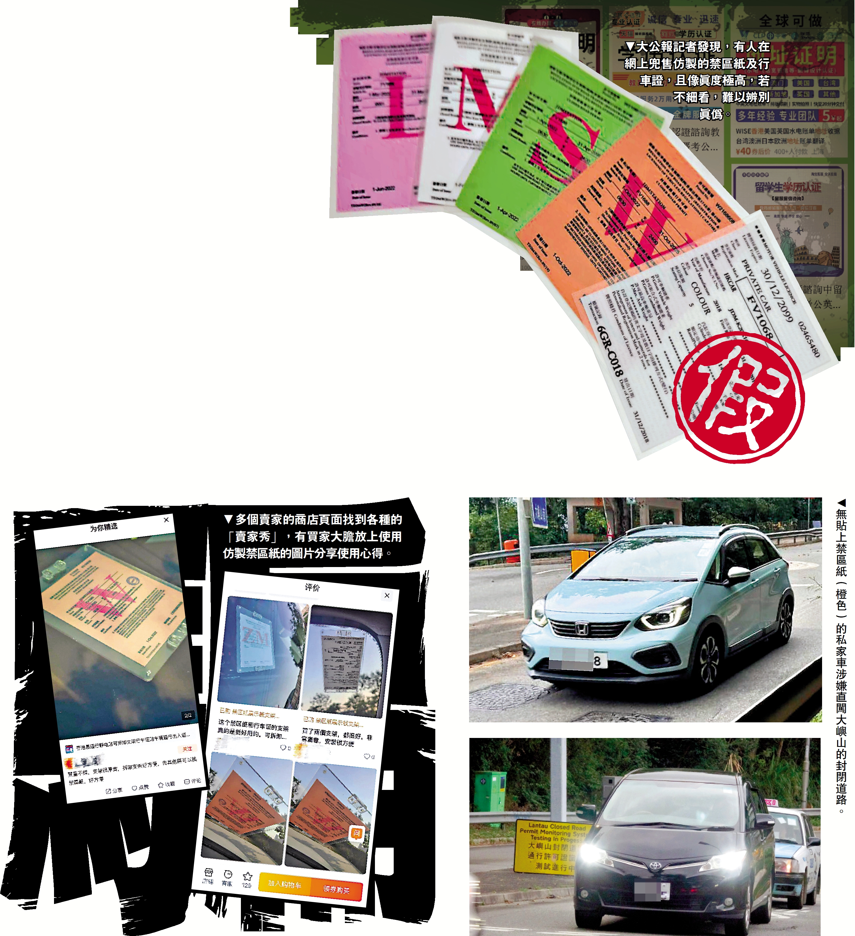 大公報記者早前在網上平台發現,有人兜售仿製禁區紙及行車證。為避開偵查,賣家一般會以「禁區紙展示板」、「行車證保護支架」等字眼作標題,不少賣家的月售量更達至每月300張以上,可見仿製禁區紙及行車證是熱銷商品。更甚者,記者在多個賣家的網店頁面找到各種的「賣家秀」,有買家大膽放上使用仿製禁區紙的圖片分享使用心得。有人表示「非常方便,不用的時候可以取下來,去其他區又可以隨時換」。